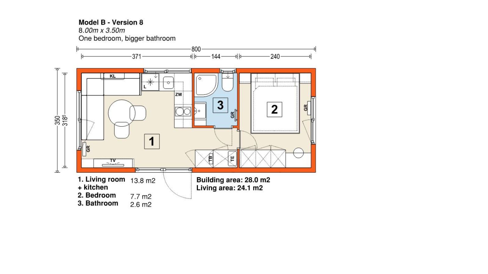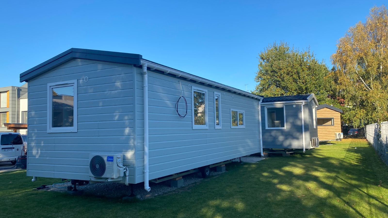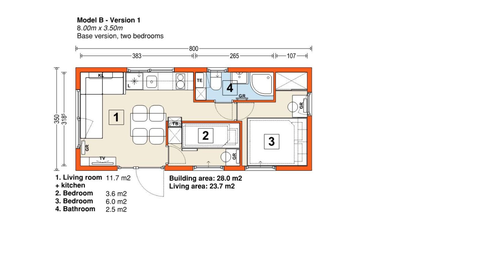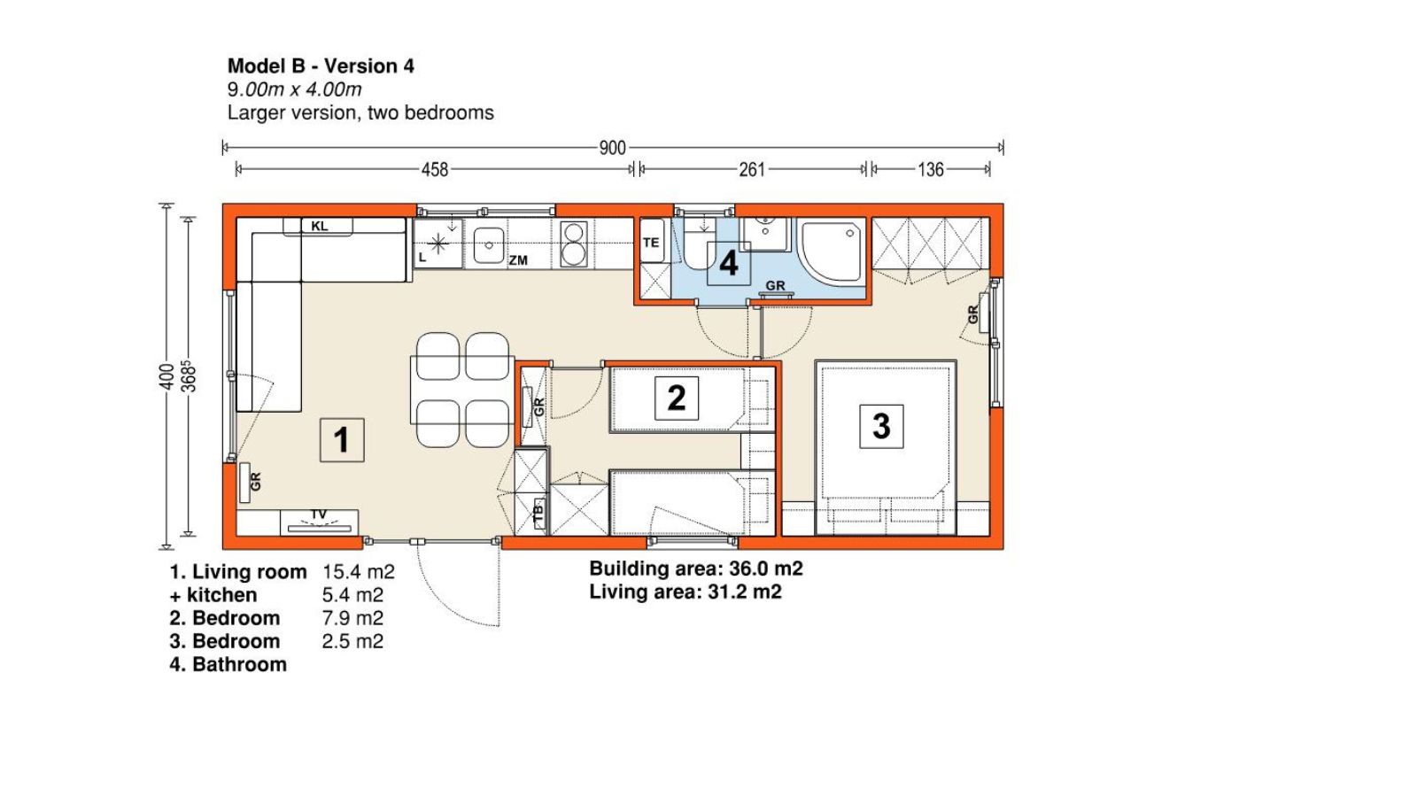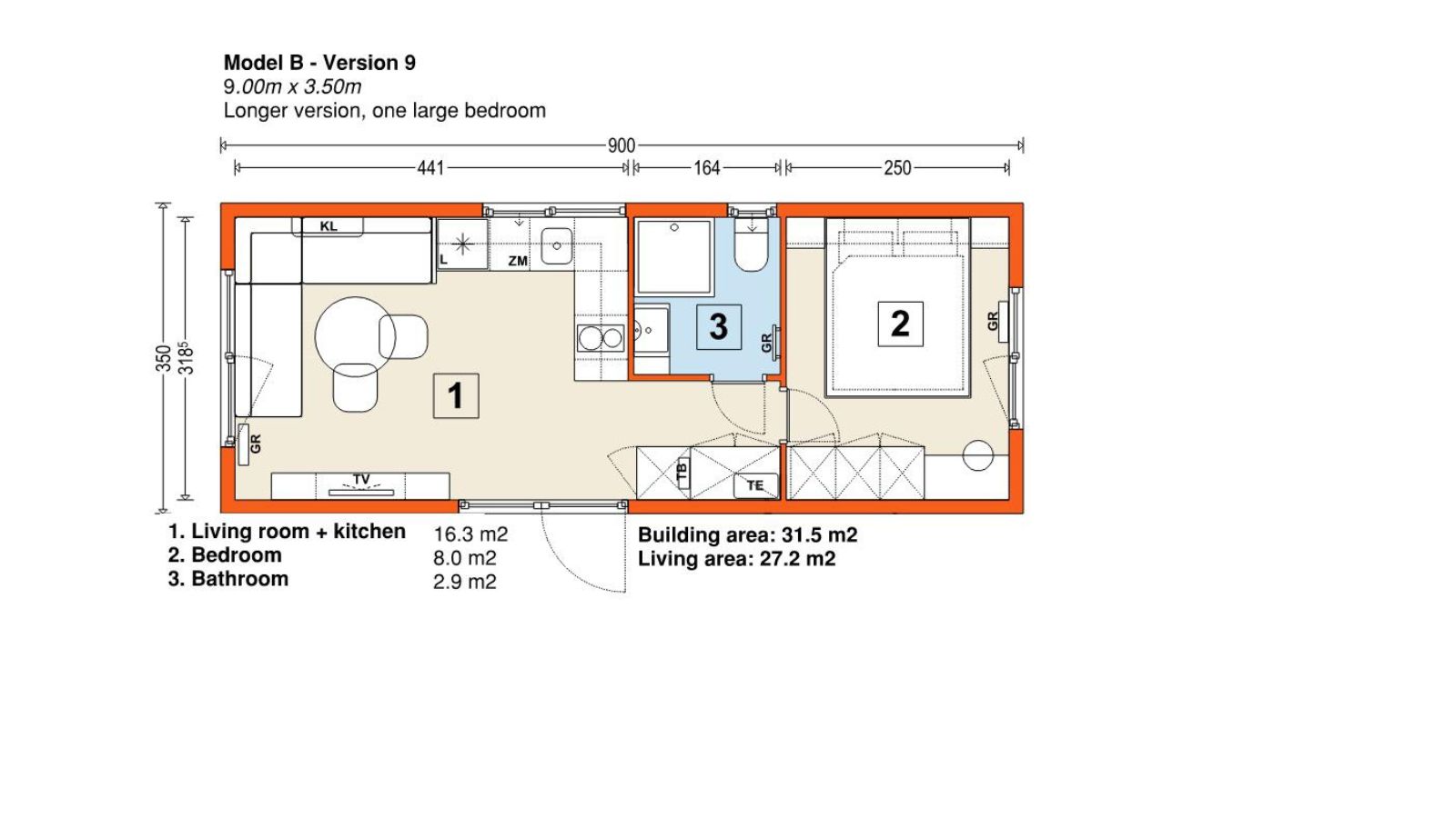 Modell B – husbil på hjul. Det är den minsta husbilsmodellen på vårt utbud, med en mycket smart och genialiskt löst inredning. Huset är litet och effektivt och funktionellt och tar inte mycket plats. Model B är baserad på skandinavisk stil och en enkel traditionell form. Stugan kommer i tre yttre dimensioner. Huset har 12 funktionella interiörvarianter. Det yttre utseendet, såsom färgschema, materialval och fönsterplacering, kan anpassas för att möta kundens krav. Stugan är rektangulär, täckt med ett mjukt tak med en lutning på 12 grader. Takets vinkel kan fritt ökas – anpassas till de lokala kraven på tomten.