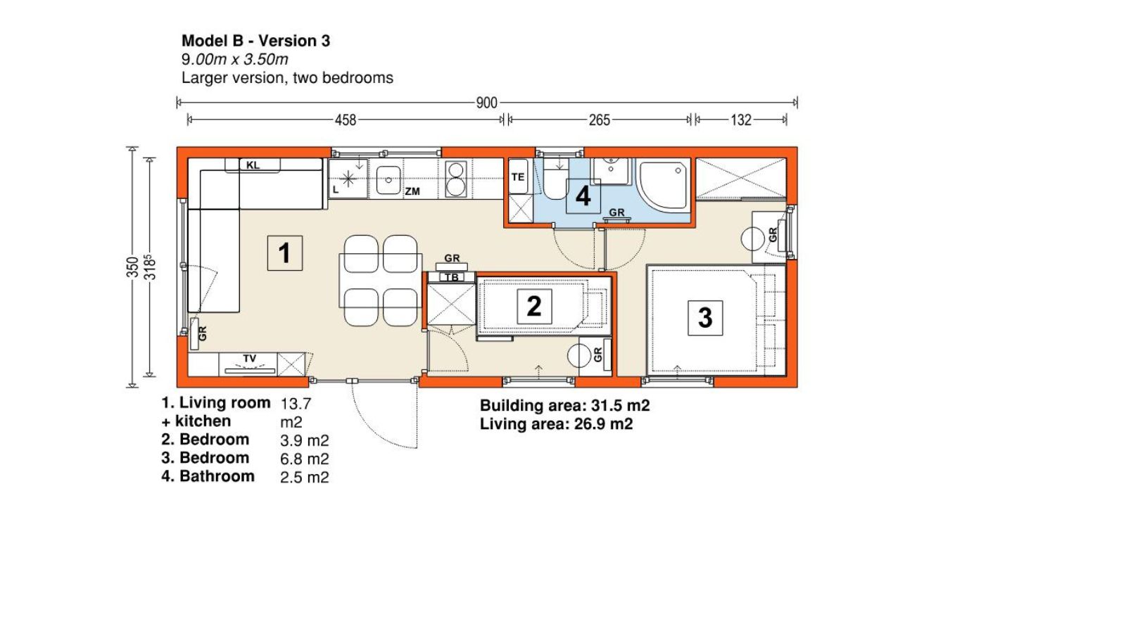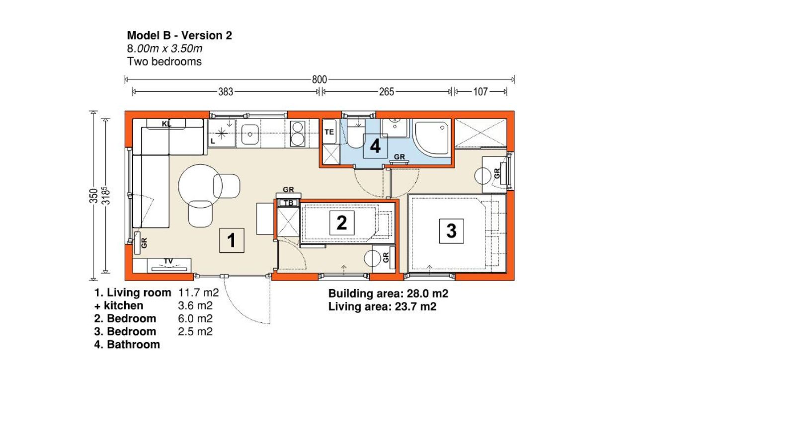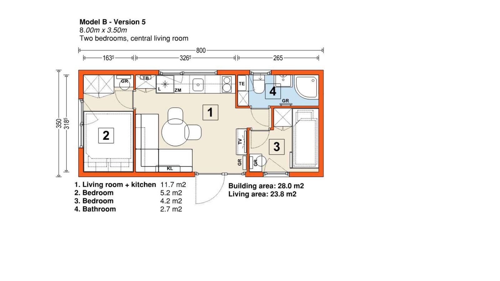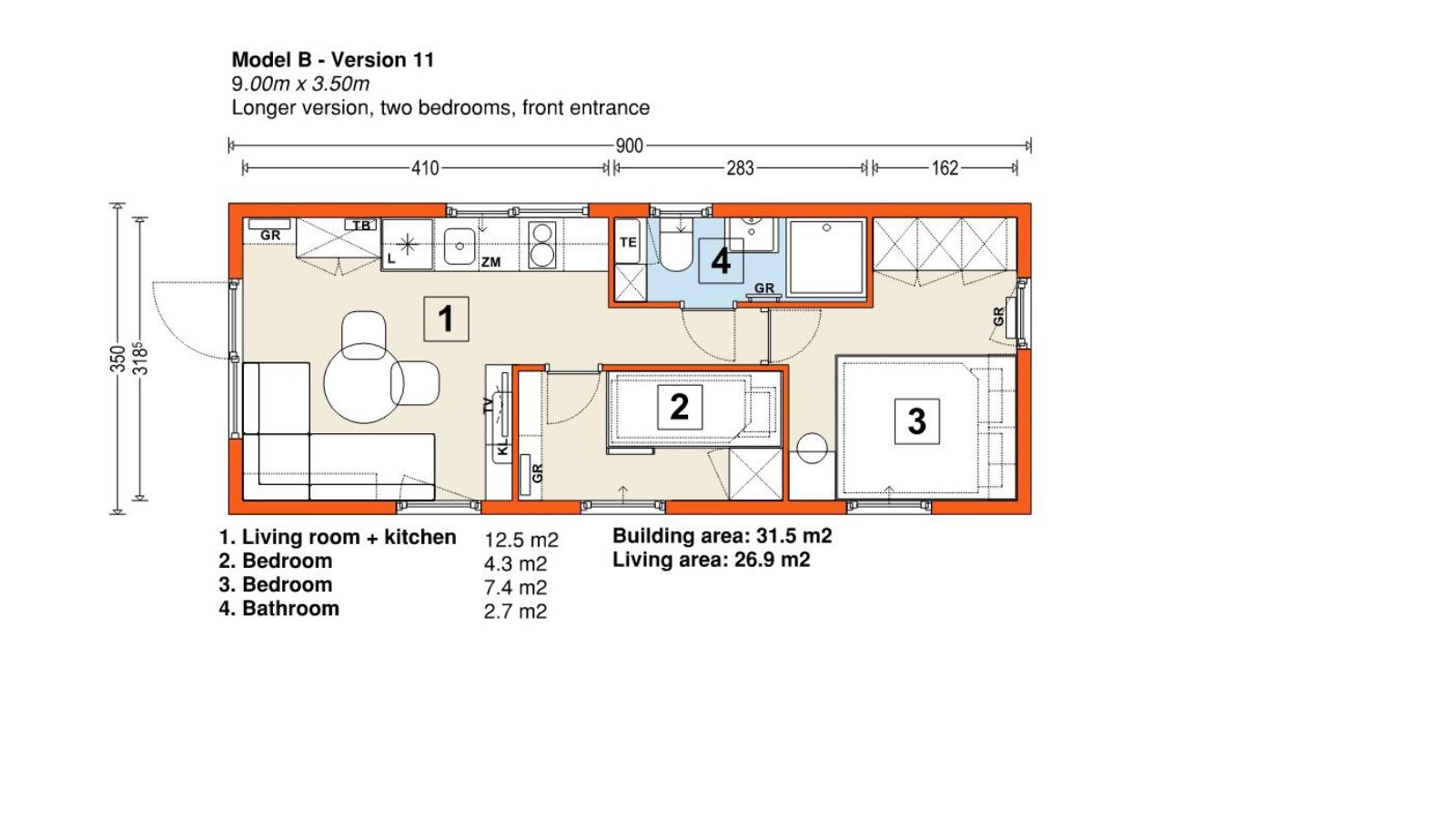 Modell B – husbil på hjul. Det är den minsta husbilsmodellen på vårt utbud, med en mycket smart och genialiskt löst inredning. Huset är litet och effektivt och funktionellt och tar inte mycket plats. Model B är baserad på skandinavisk stil och en enkel traditionell form. Stugan kommer i tre yttre dimensioner. Huset har 12 funktionella interiörvarianter. Det yttre utseendet, såsom färgschema, materialval och fönsterplacering, kan anpassas för att möta kundens krav. Stugan är rektangulär, täckt med ett mjukt tak med en lutning på 12 grader. Takets vinkel kan fritt ökas – anpassas till de lokala kraven på tomten.