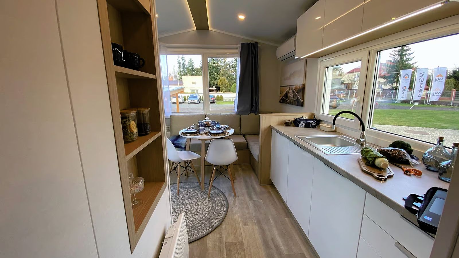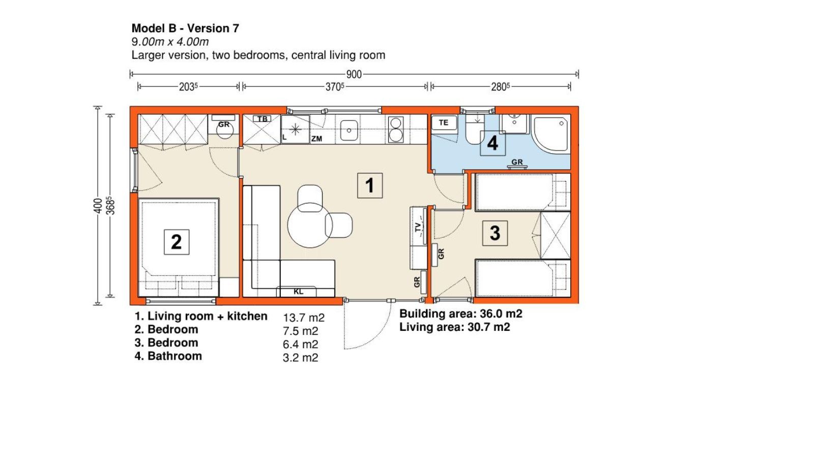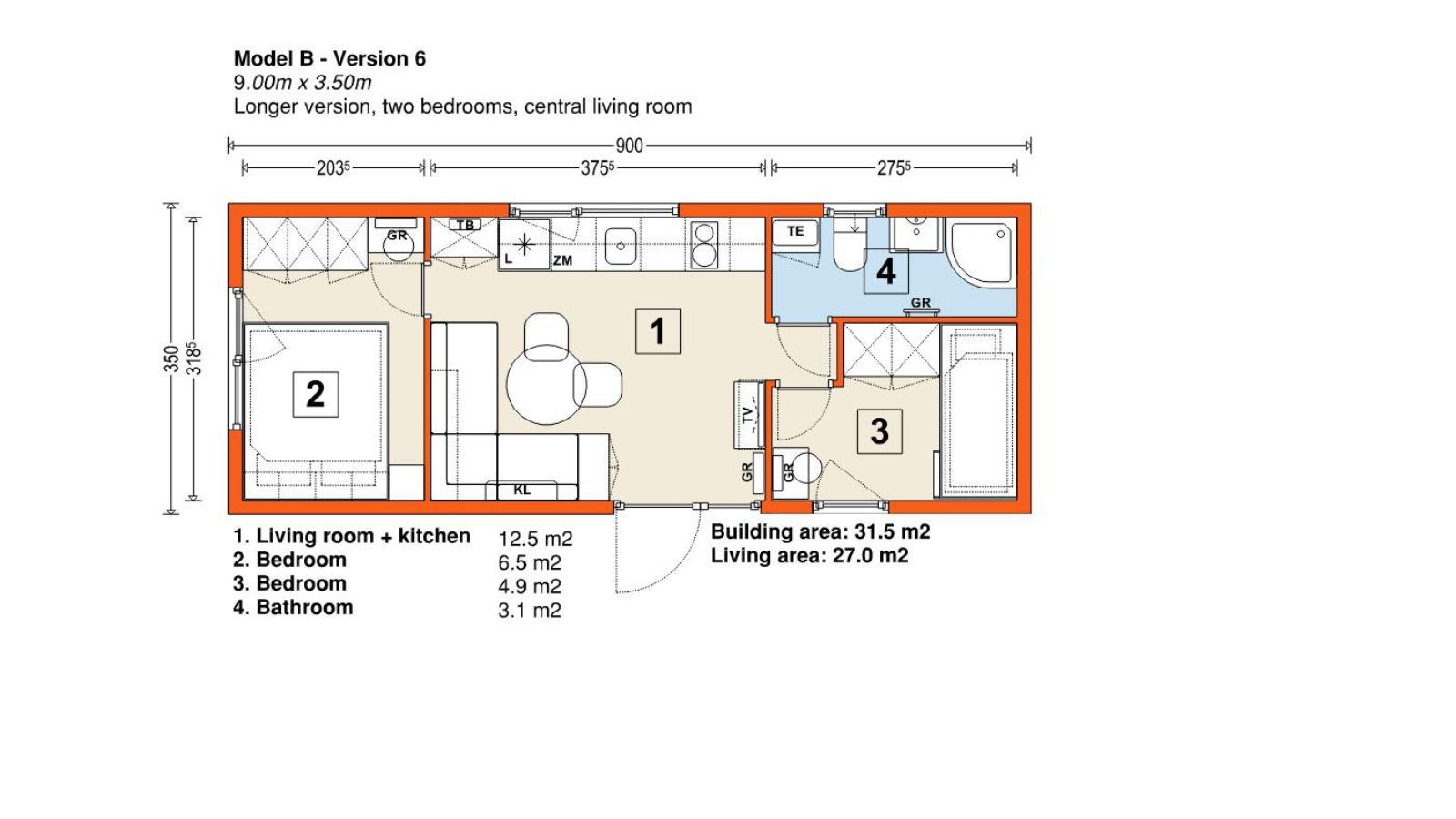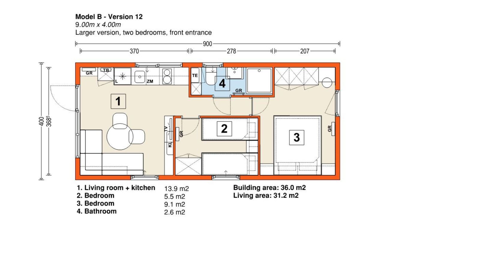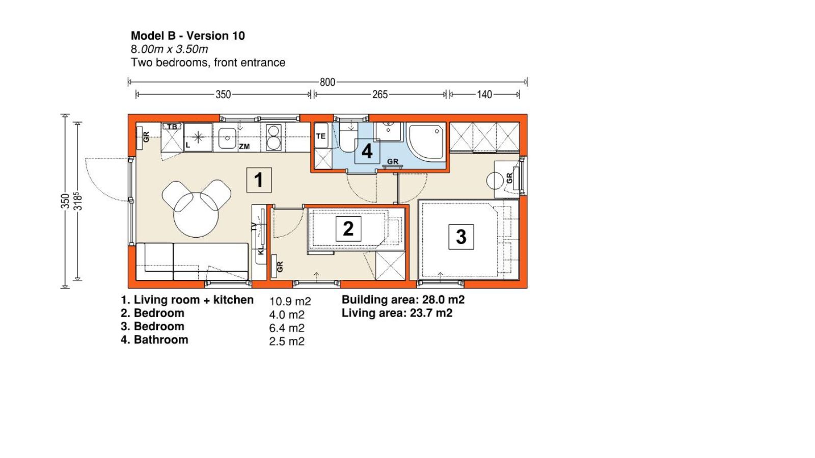 Modell B – husbil på hjul. Det är den minsta husbilsmodellen på vårt utbud, med en mycket smart och genialiskt löst inredning. Huset är litet och effektivt och funktionellt och tar inte mycket plats. Model B är baserad på skandinavisk stil och en enkel traditionell form. Stugan kommer i tre yttre dimensioner. Huset har 12 funktionella interiörvarianter. Det yttre utseendet, såsom färgschema, materialval och fönsterplacering, kan anpassas för att möta kundens krav. Stugan är rektangulär, täckt med ett mjukt tak med en lutning på 12 grader. Takets vinkel kan fritt ökas – anpassas till de lokala kraven på tomten.