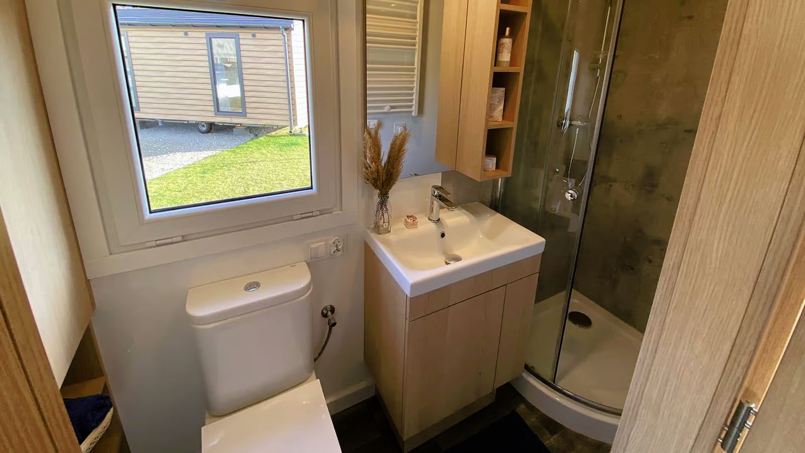 - Badrum: Kompakt toalettstol, duschbricka och beslag
