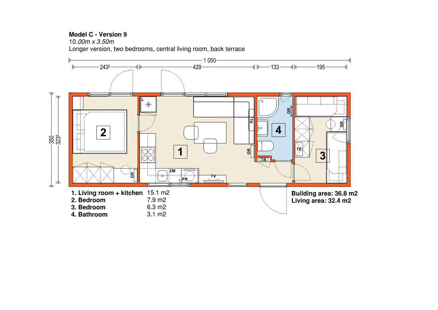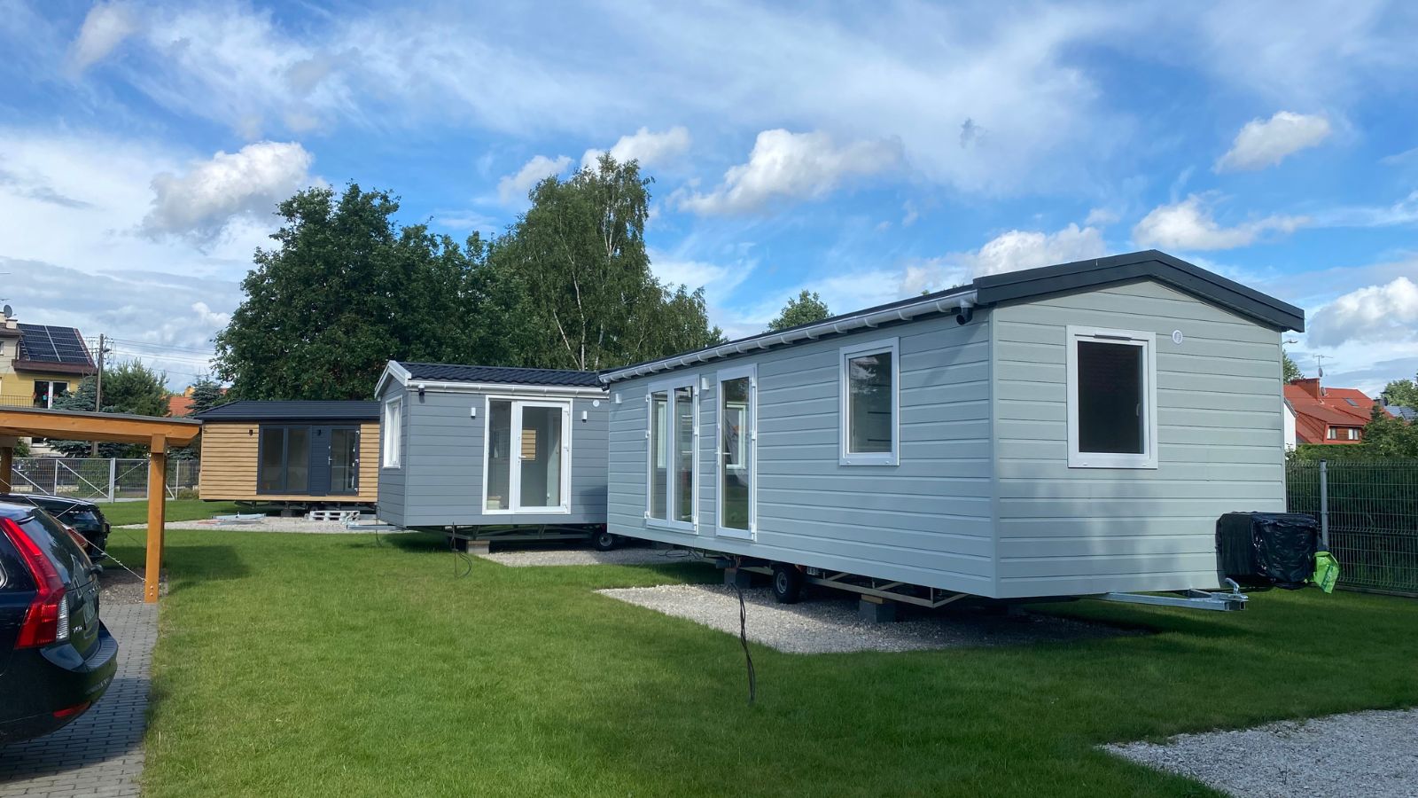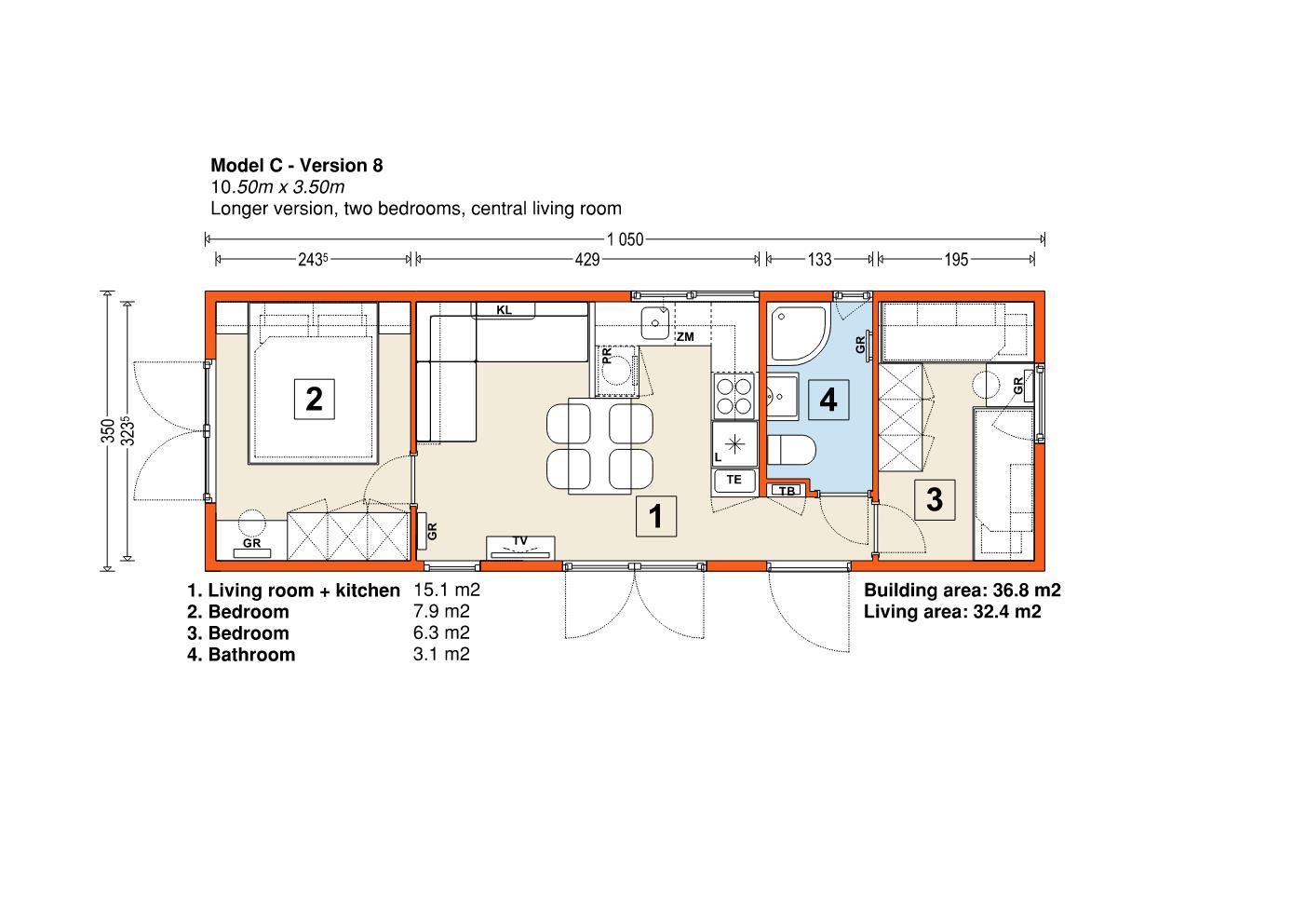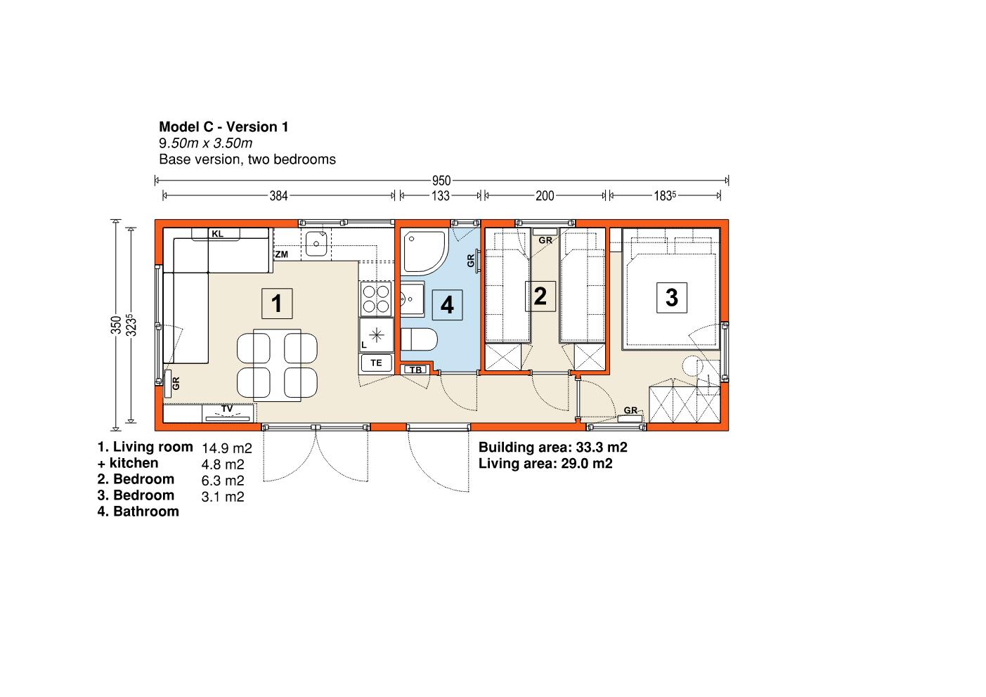 Modell C – husbil på hjul. Vårt förslag är en medelstor husbil inom intervallet 33 m² – 37 m² bebyggd yta. Det är en praktisk, funktionell stuga med modern stil, upprätthållen i ett ljust, rent färgschema, rimligt skalat och prissatt. Huset har tio tillgängliga inredningsvarianter. Det yttre utseendet – färgschema, val av ytbehandlingsmaterial och fönsterplacering kan skräddarsys efter kundens specifika önskemål. Huset är rektangulärt, täckt med tak i 12 graders lutning.