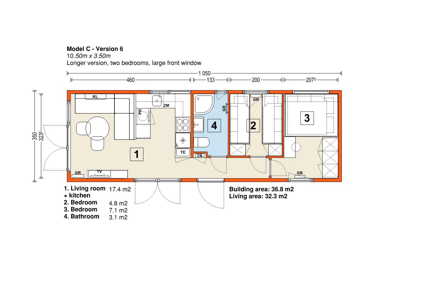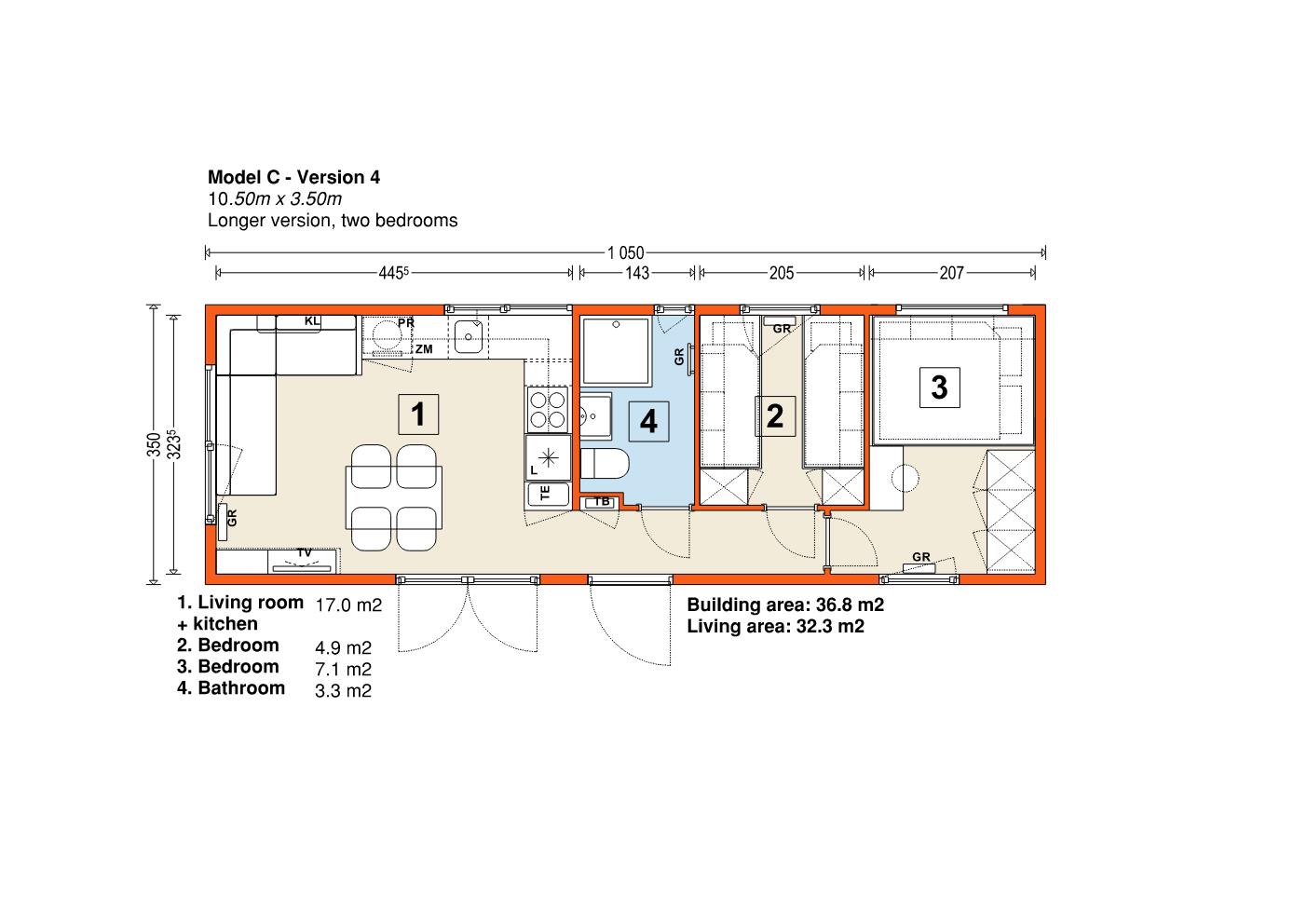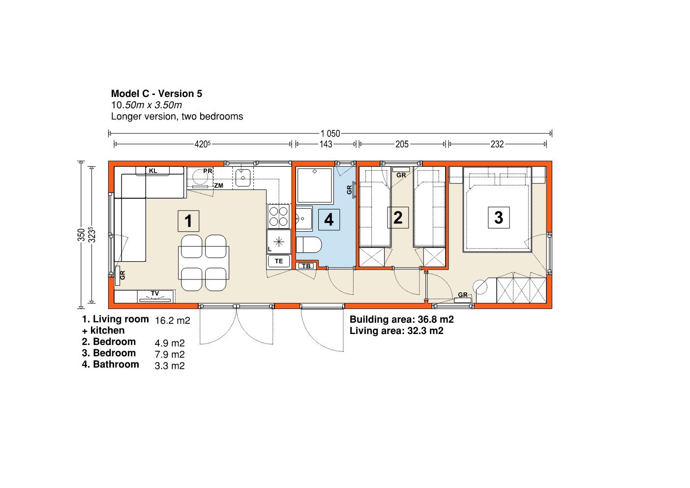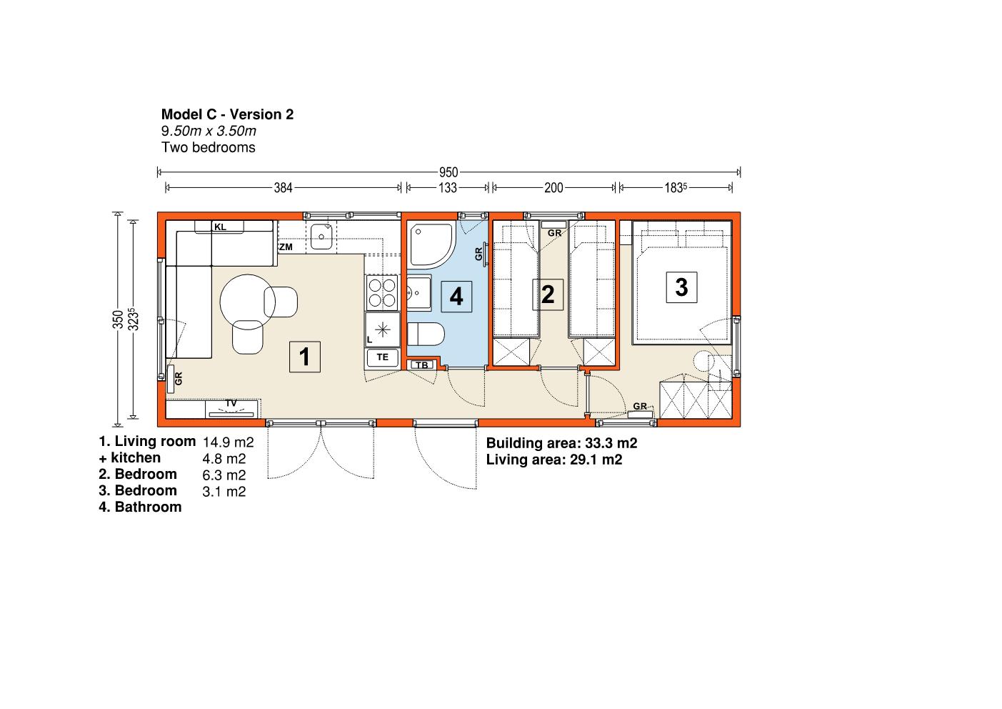 Modell C – husbil på hjul. Vårt förslag är en medelstor husbil inom intervallet 33 m² – 37 m² bebyggd yta. Det är en praktisk, funktionell stuga med modern stil, upprätthållen i ett ljust, rent färgschema, rimligt skalat och prissatt. Huset har tio tillgängliga inredningsvarianter. Det yttre utseendet – färgschema, val av ytbehandlingsmaterial och fönsterplacering kan skräddarsys efter kundens specifika önskemål. Huset är rektangulärt, täckt med tak i 12 graders lutning.
