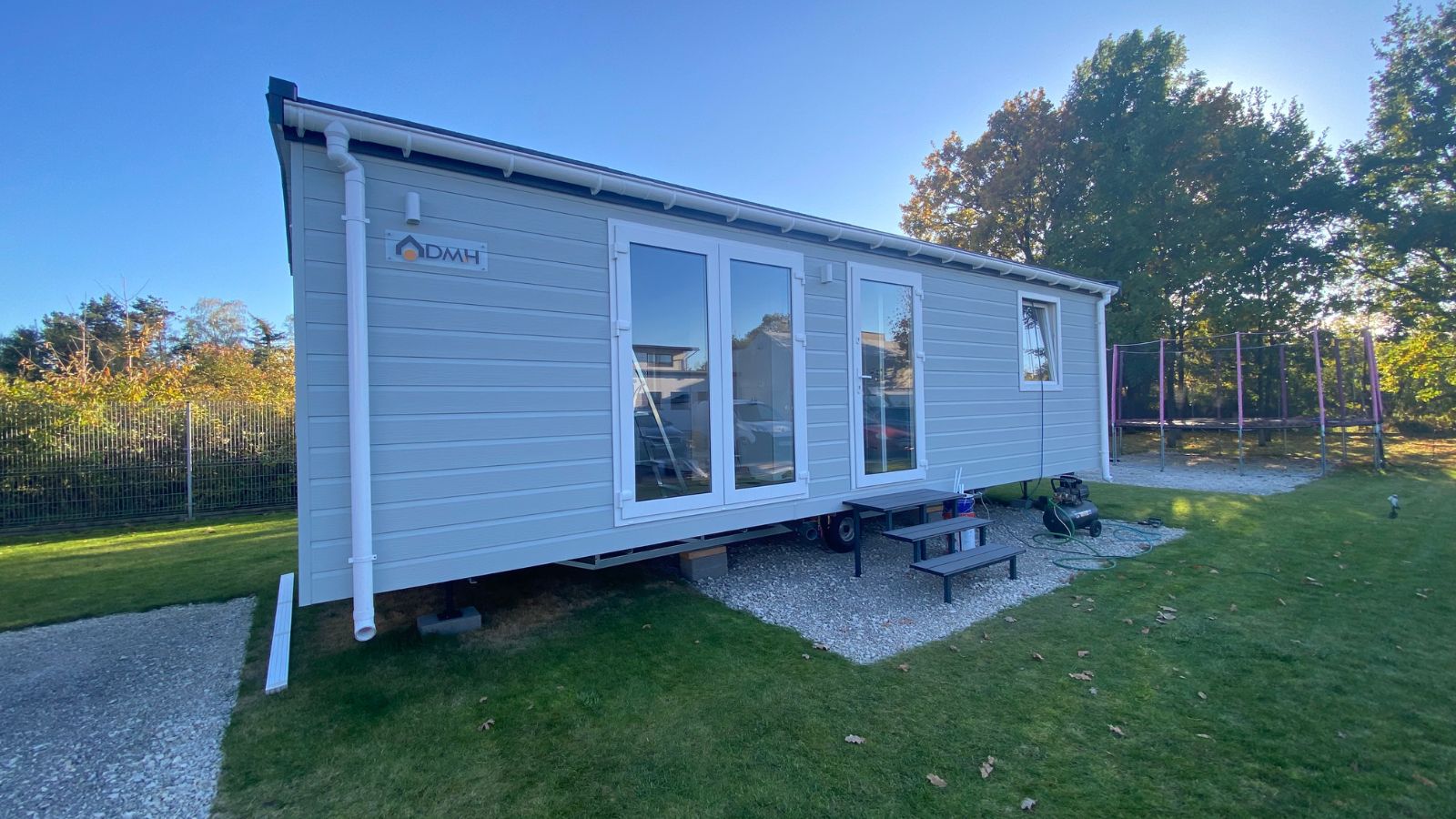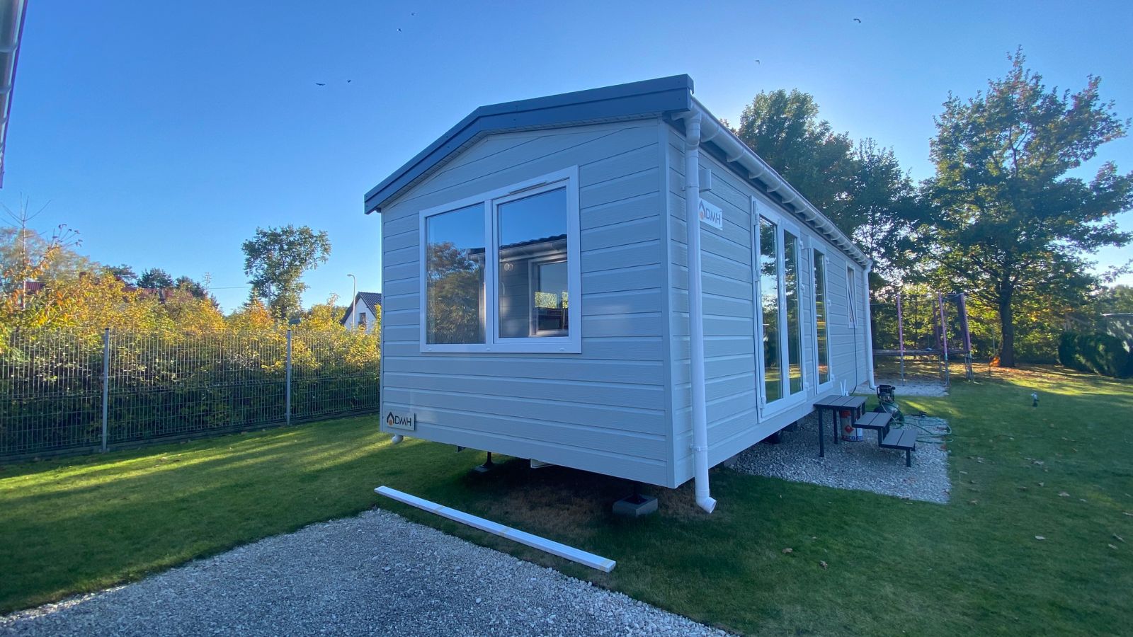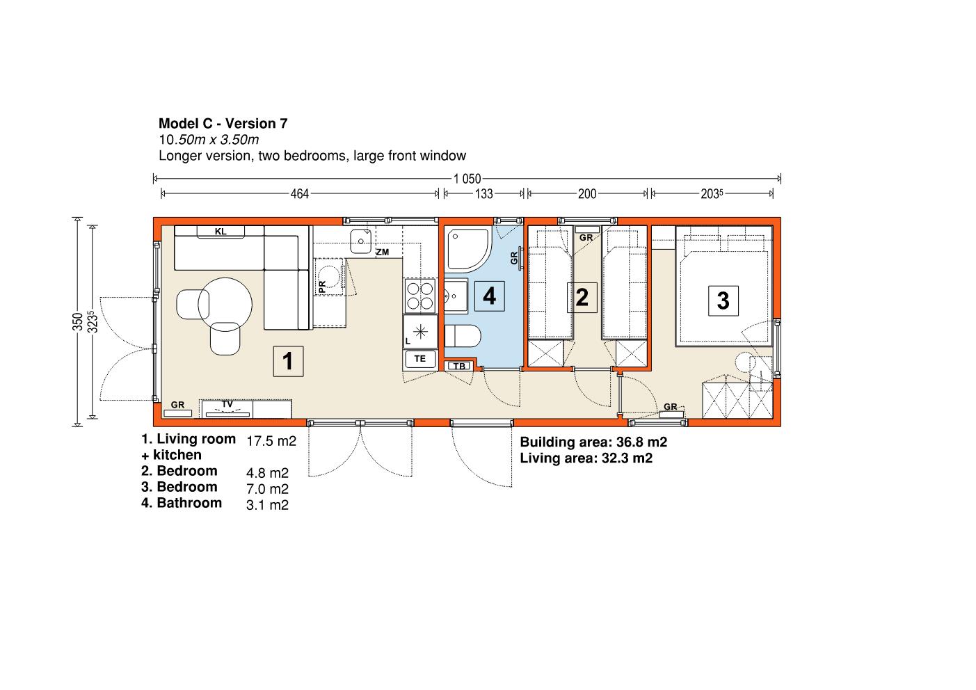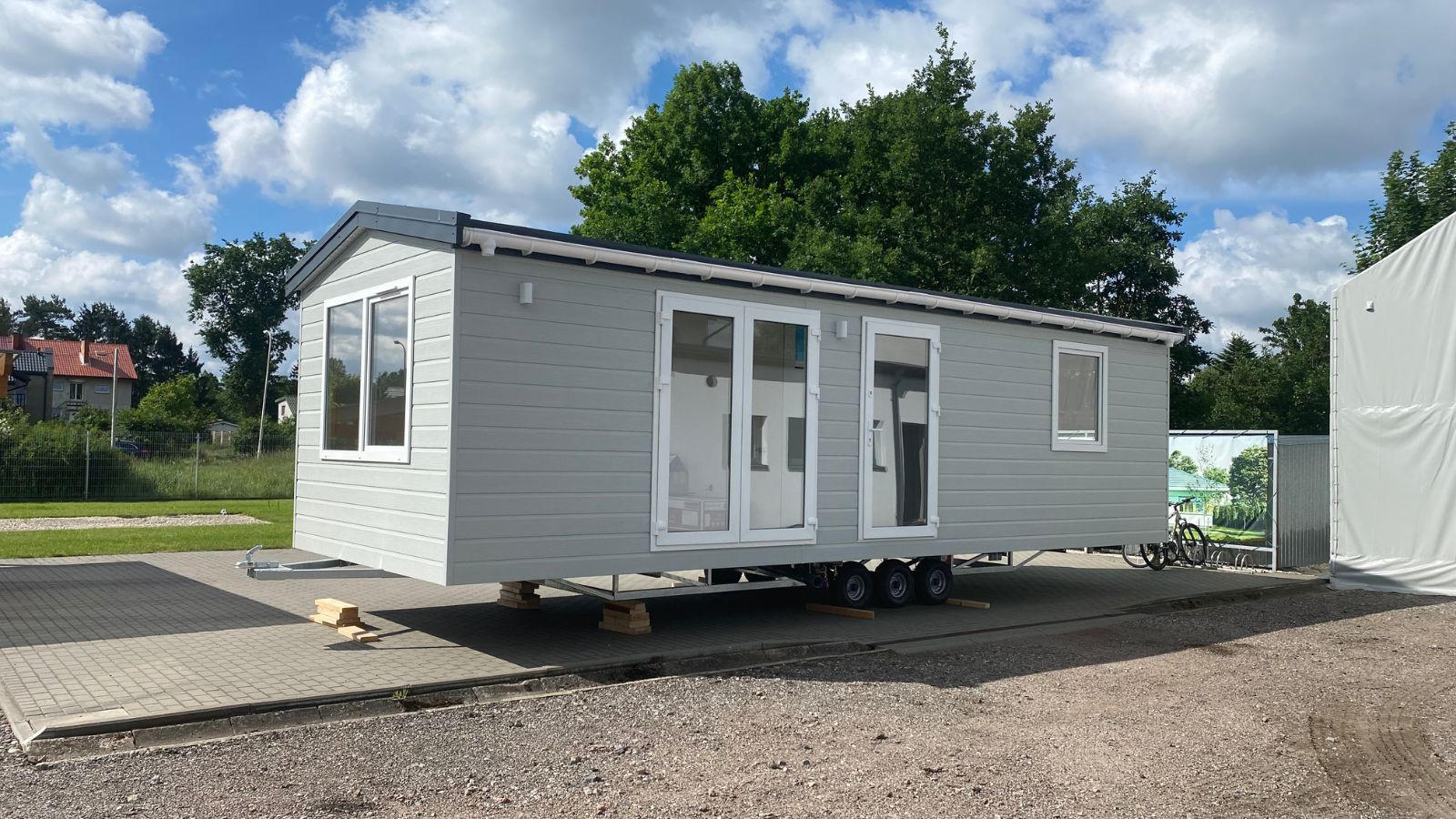 Modell C – husbil på hjul. Vårt förslag är en medelstor husbil inom intervallet 33 m² – 37 m² bebyggd yta. Det är en praktisk, funktionell stuga med modern stil, upprätthållen i ett ljust, rent färgschema, rimligt skalat och prissatt. Huset har tio tillgängliga inredningsvarianter. Det yttre utseendet – färgschema, val av ytbehandlingsmaterial och fönsterplacering kan skräddarsys efter kundens specifika önskemål. Huset är rektangulärt, täckt med tak i 12 graders lutning.