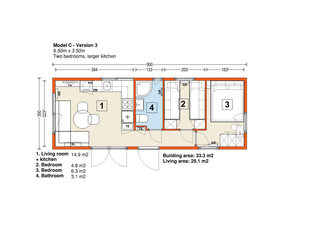 - Utanför mått: längd 9.5 m, bredd 3.5 m, höjd 3.4 m