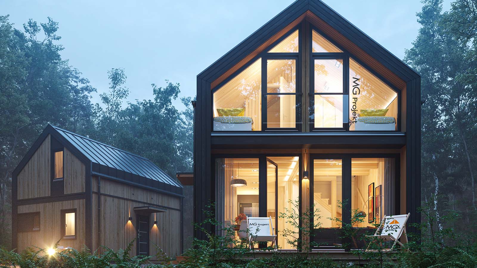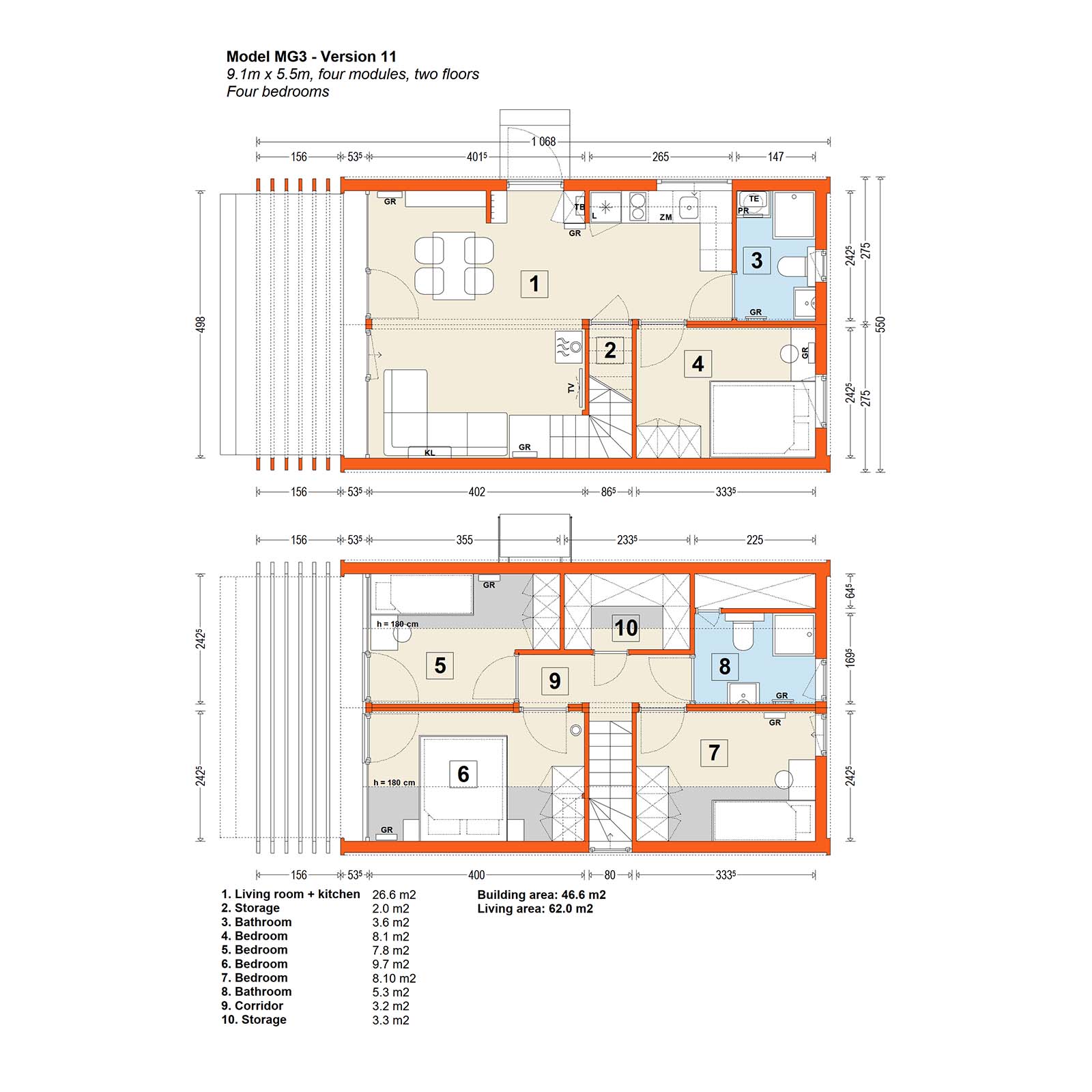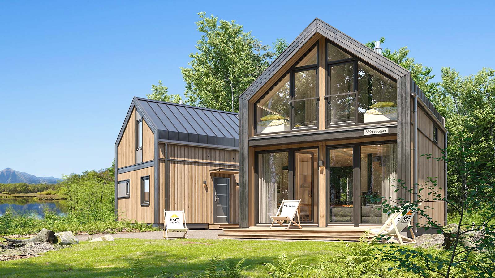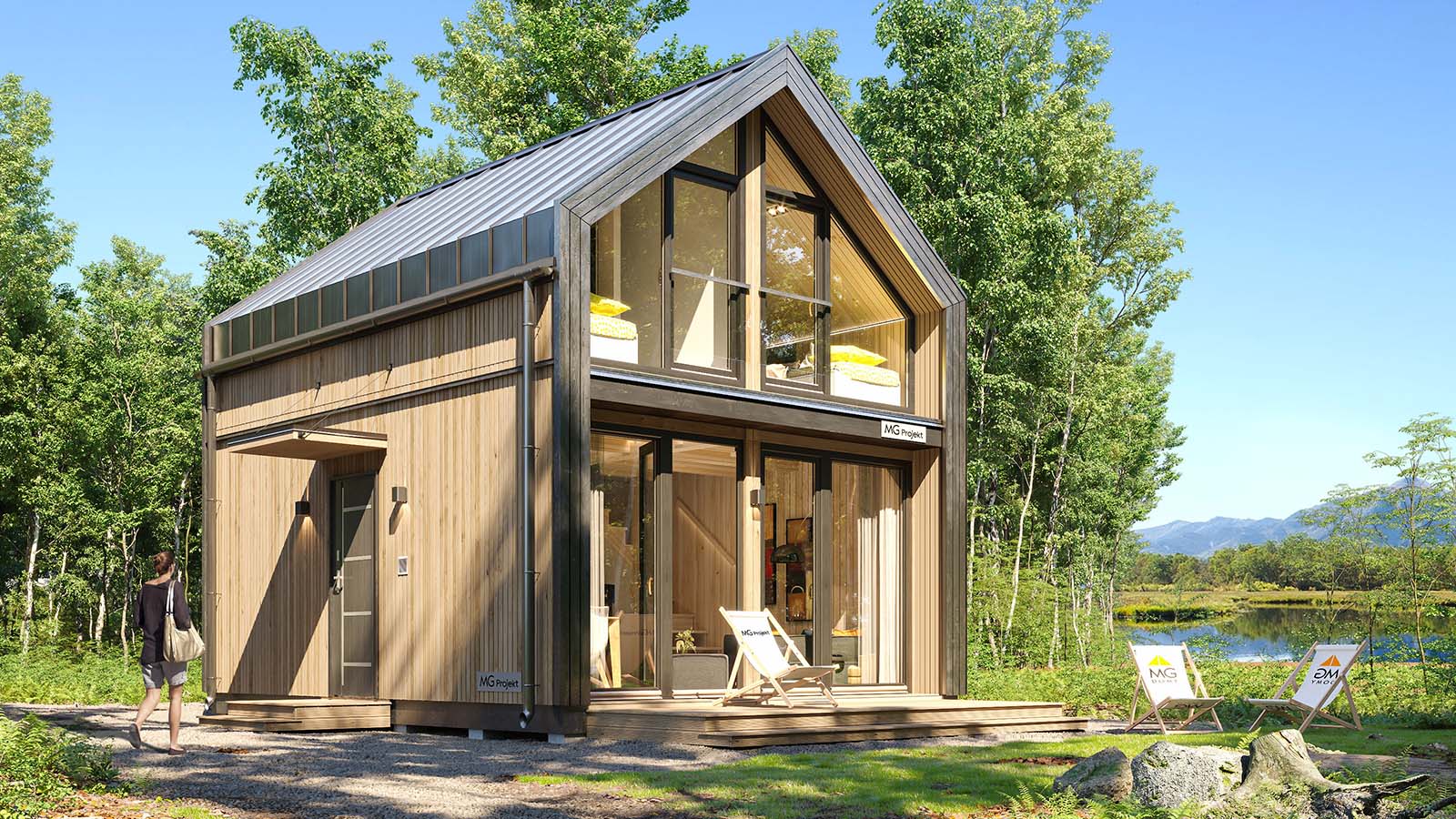 Modell MG3 – modulärt trähus. Det är en fyramodulsbyggnad som kan monteras på en dag. Den finns i 17 varianter med olika storlekar och layouter, från 38.5 m2 till 71.8 m2. Huset har en minimalistisk design med en träfasad och anpassningsbara färger. Det kan utökas genom att lägga till fler moduler och fasaden kan färdigställas med trä, stål eller kompositpaneler.