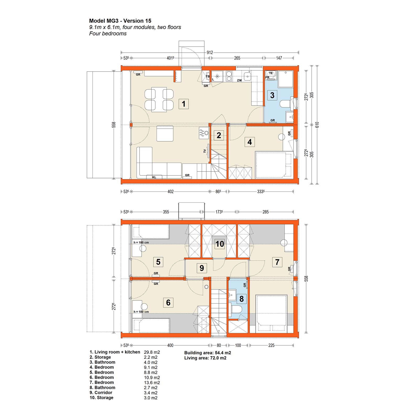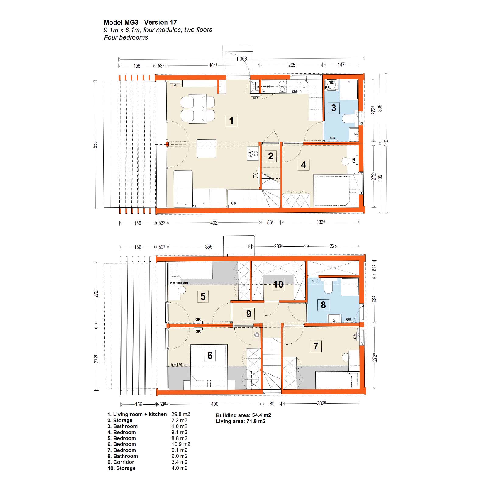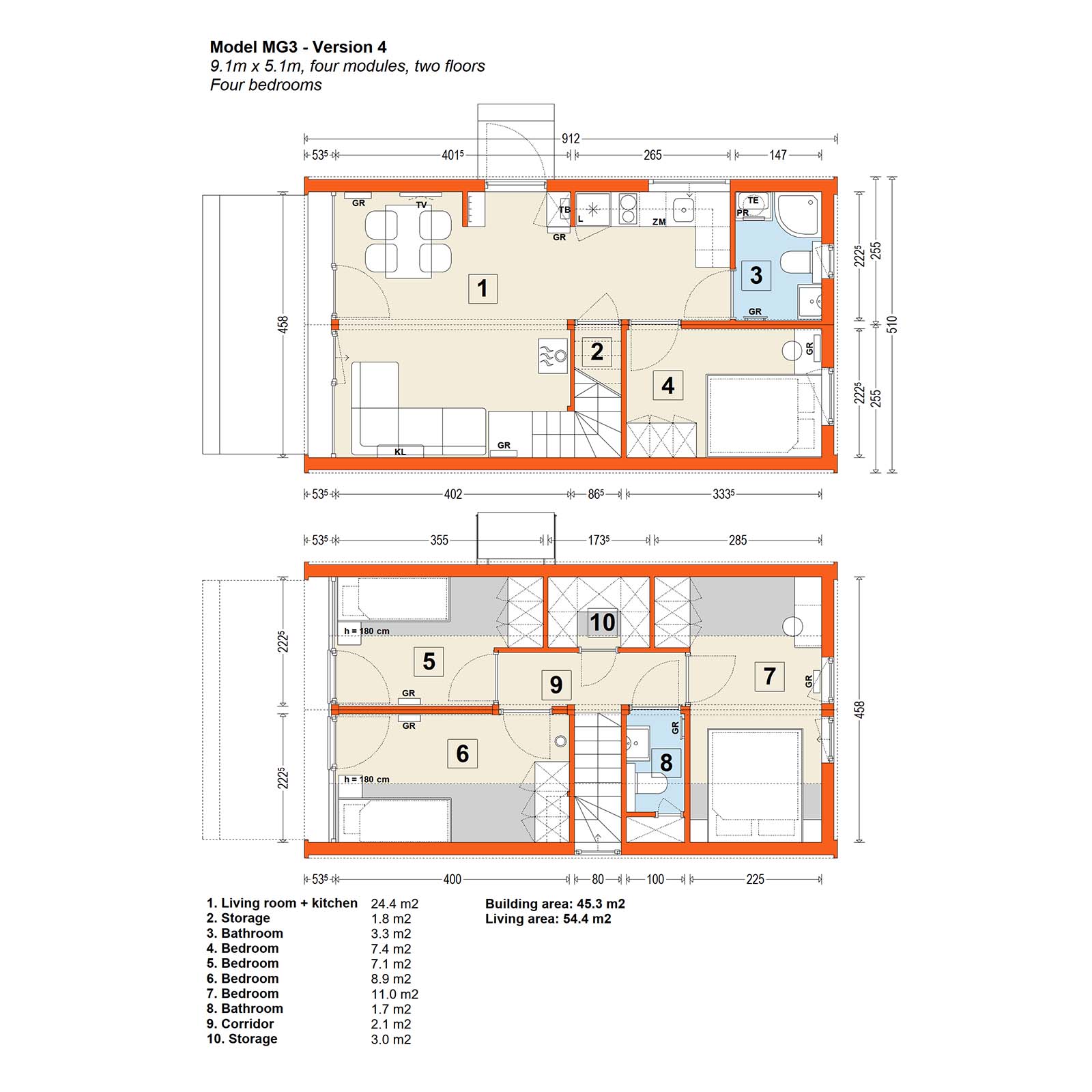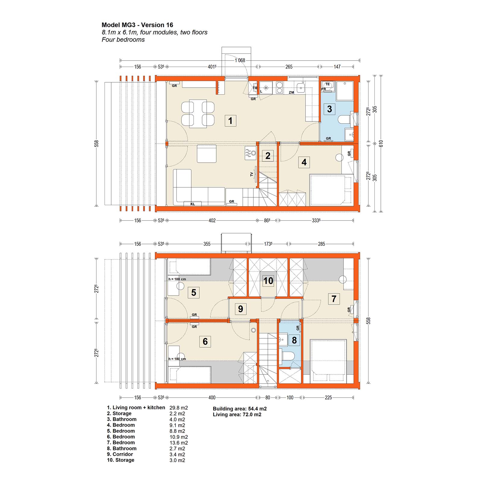 Modell MG3 – modulärt trähus. Det är en fyramodulsbyggnad som kan monteras på en dag. Den finns i 17 varianter med olika storlekar och layouter, från 38.5 m2 till 71.8 m2. Huset har en minimalistisk design med en träfasad och anpassningsbara färger. Det kan utökas genom att lägga till fler moduler och fasaden kan färdigställas med trä, stål eller kompositpaneler.