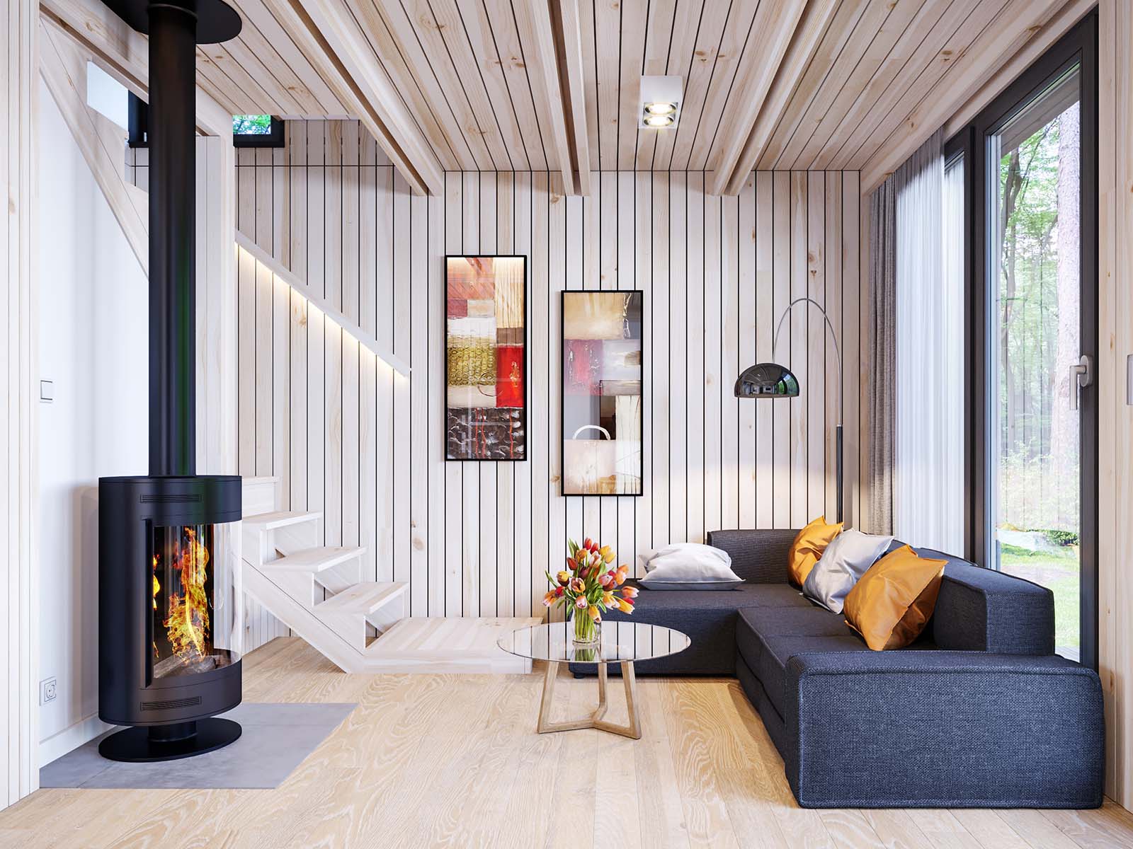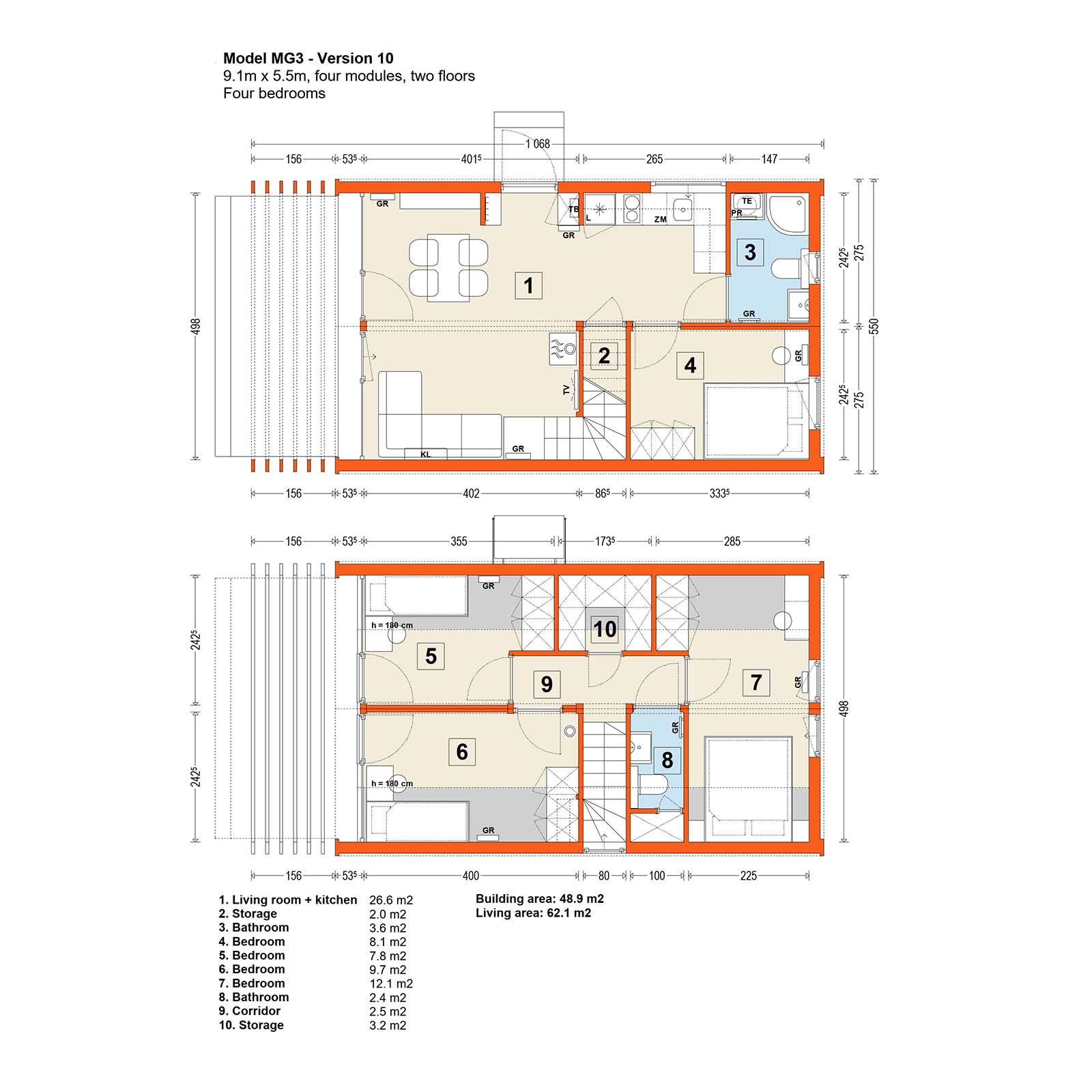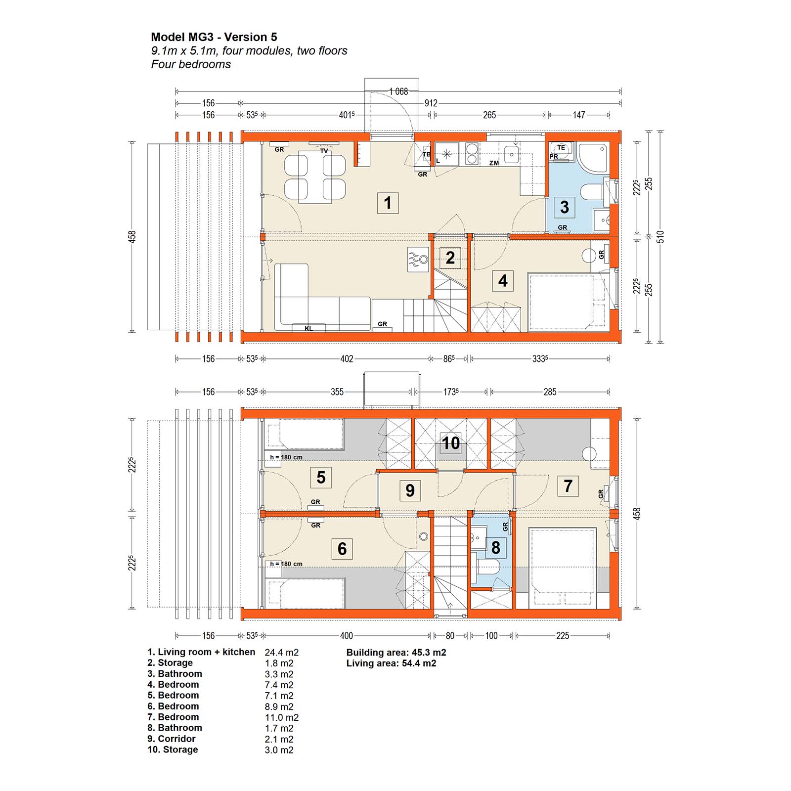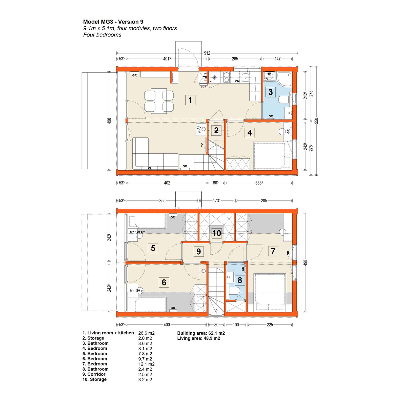 Modell MG3 – modulärt trähus. Det är en fyramodulsbyggnad som kan monteras på en dag. Den finns i 17 varianter med olika storlekar och layouter, från 38.5 m2 till 71.8 m2. Huset har en minimalistisk design med en träfasad och anpassningsbara färger. Det kan utökas genom att lägga till fler moduler och fasaden kan färdigställas med trä, stål eller kompositpaneler.
