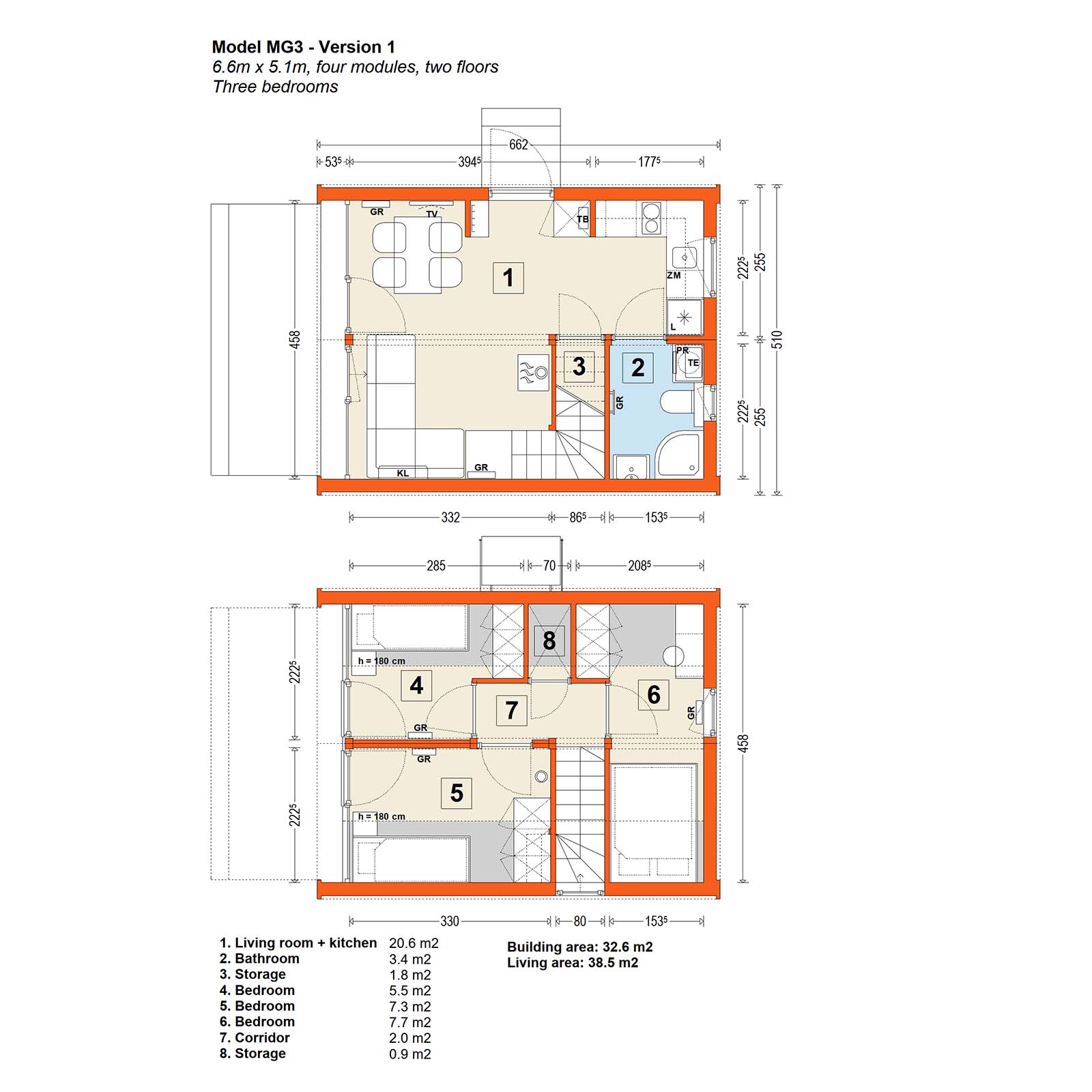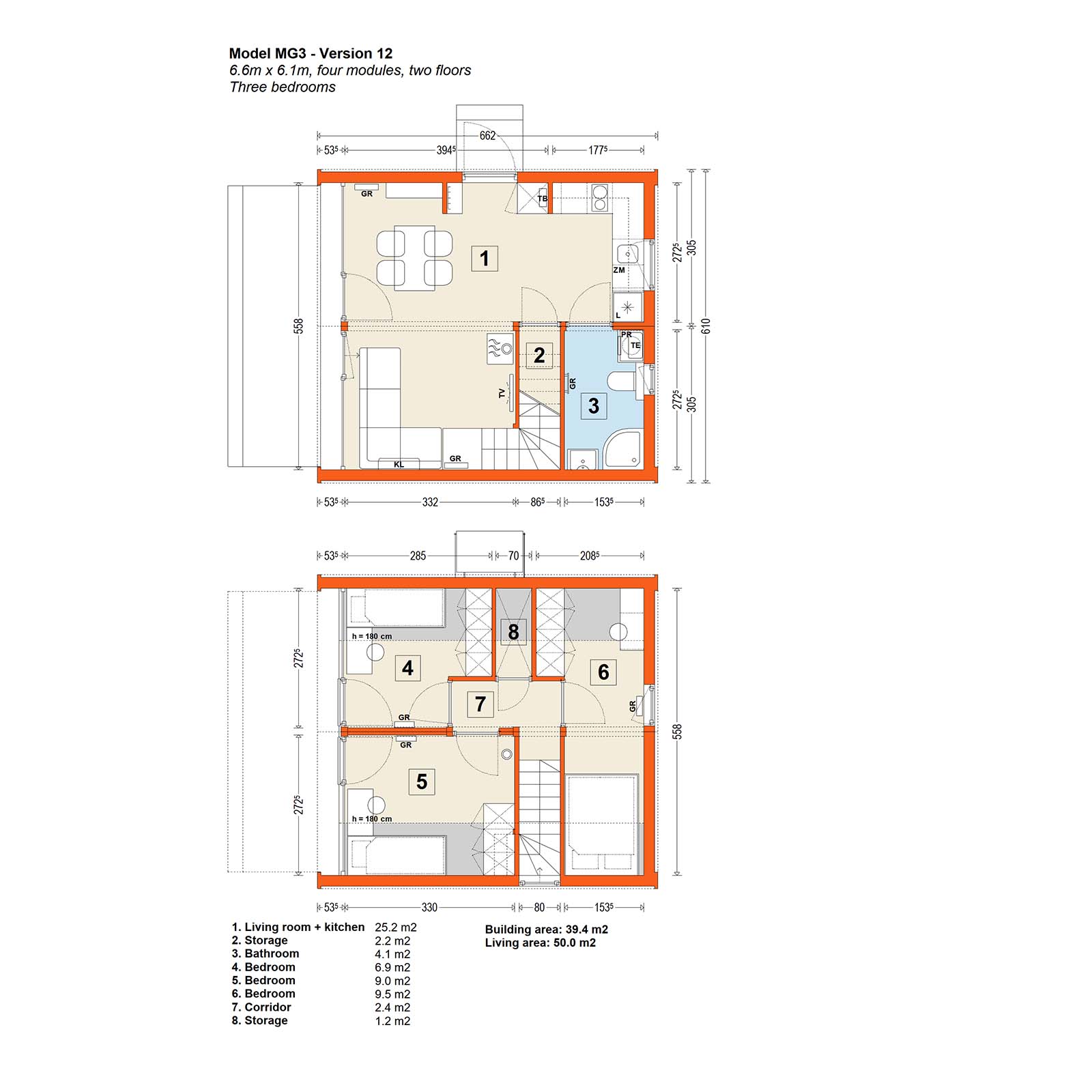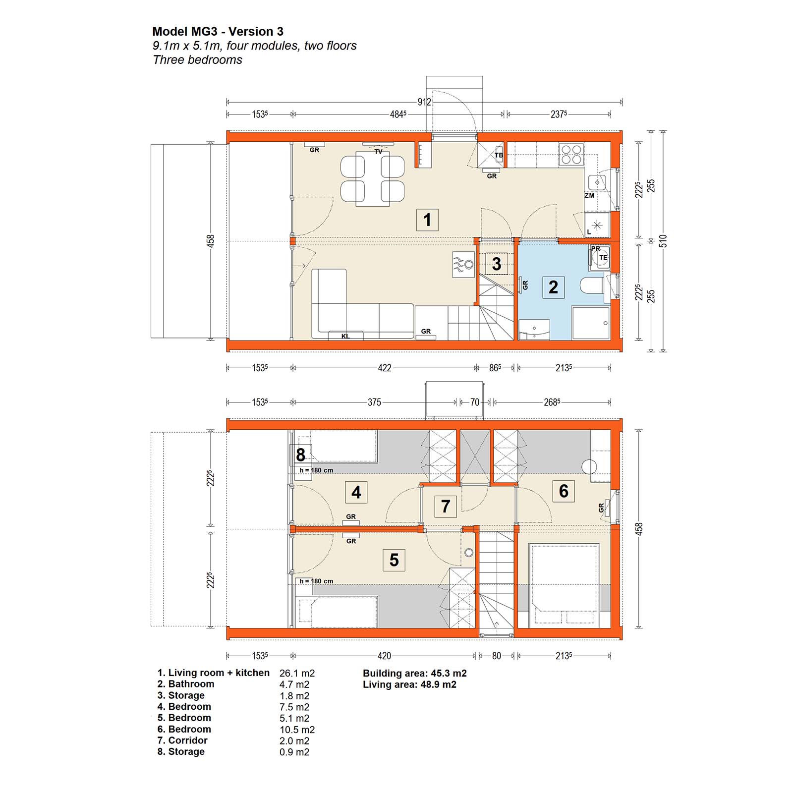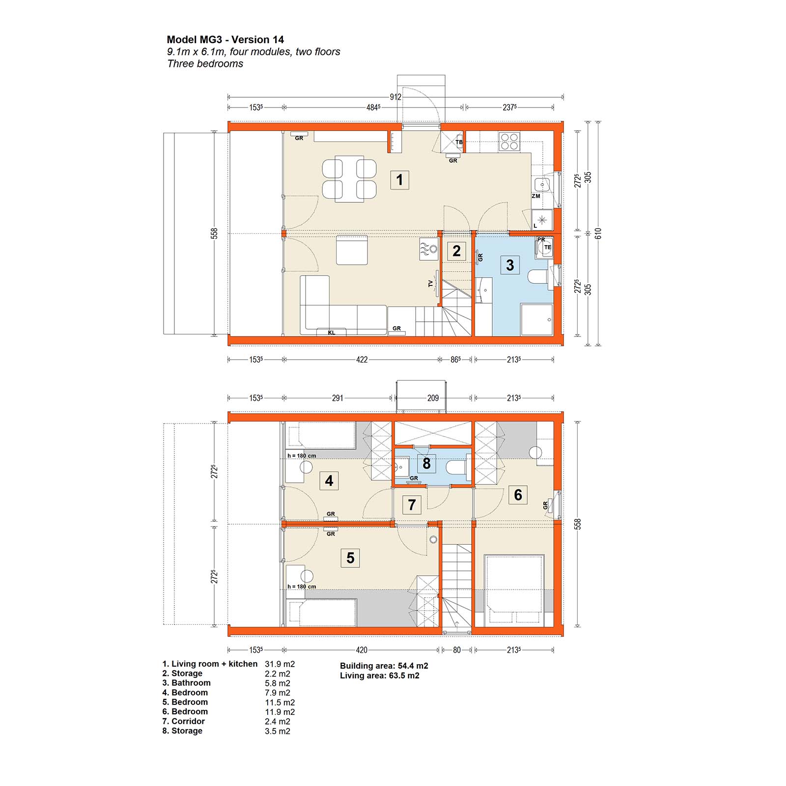 De grundläggande dimensionerna är 6.6 x 5.1 m och kan förlängas till 10.7 x 6.1 m. De största varianterna av det modulära huset MG3 erbjuder extra rum, större vardagsutrymmen samt flera sovrum och badrum. Interiören i huset är helt färdigställd med olika alternativ för vägg-, golv- och takbeklädnad. Kunder kan också välja att beställa ett fullt möblerat hus med möbler, apparater och sanitära redskap inkluderade.