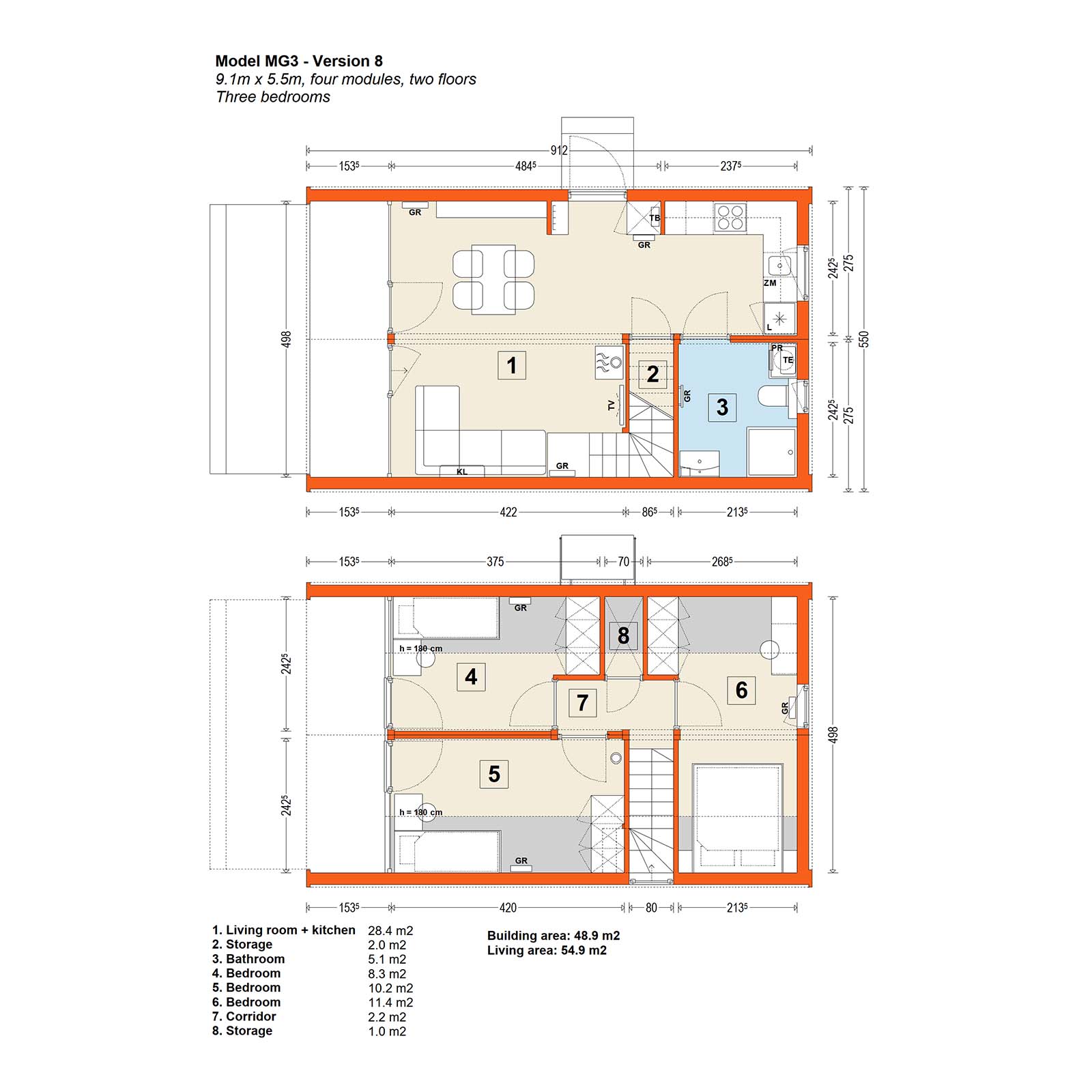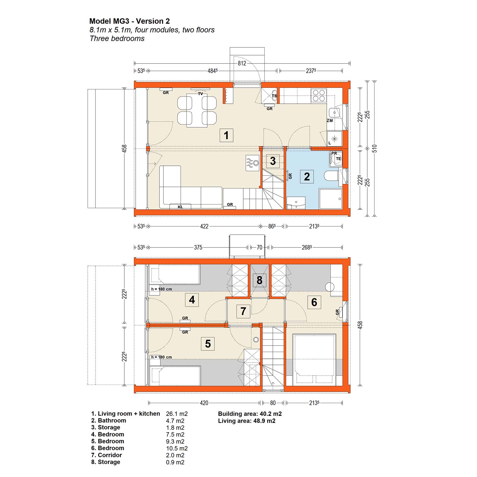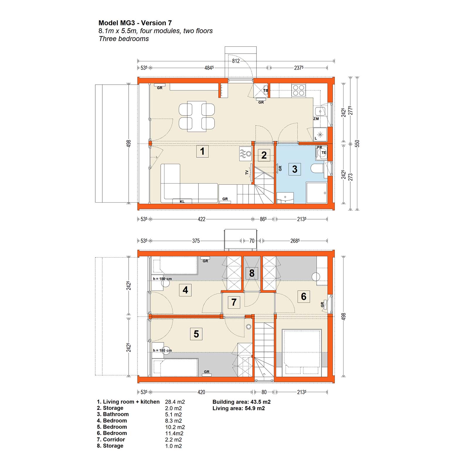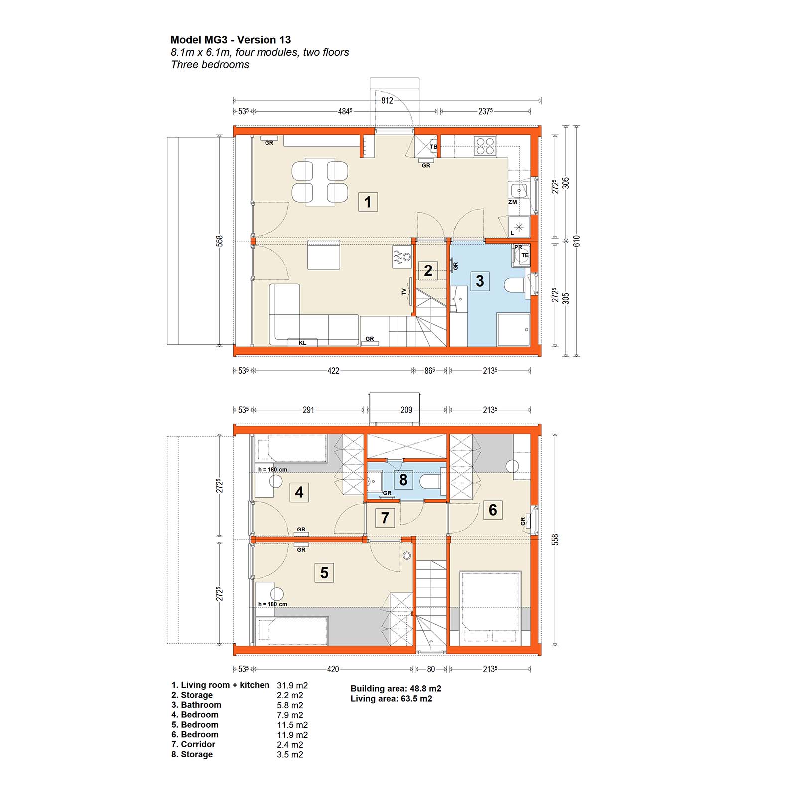 De grundläggande dimensionerna är 6.6 x 5.1 m och kan förlängas till 10.7 x 6.1 m. De största varianterna av det modulära huset MG3 erbjuder extra rum, större vardagsutrymmen samt flera sovrum och badrum. Interiören i huset är helt färdigställd med olika alternativ för vägg-, golv- och takbeklädnad. Kunder kan också välja att beställa ett fullt möblerat hus med möbler, apparater och sanitära redskap inkluderade.
