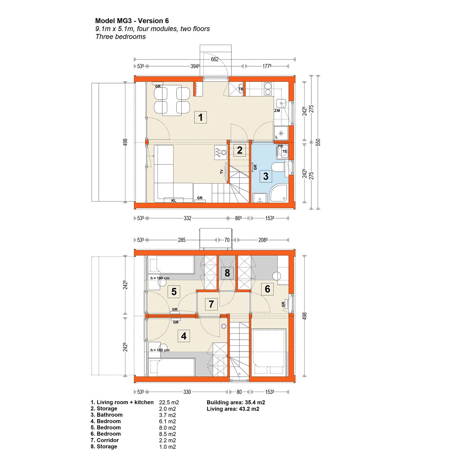 Varje modell av det modulära huset har en stål- och trästruktur, vilket garanterar hög hållbarhet och styrka. Vikten på MG3-huset, beroende på ramens storlek, är cirka 15 ton.