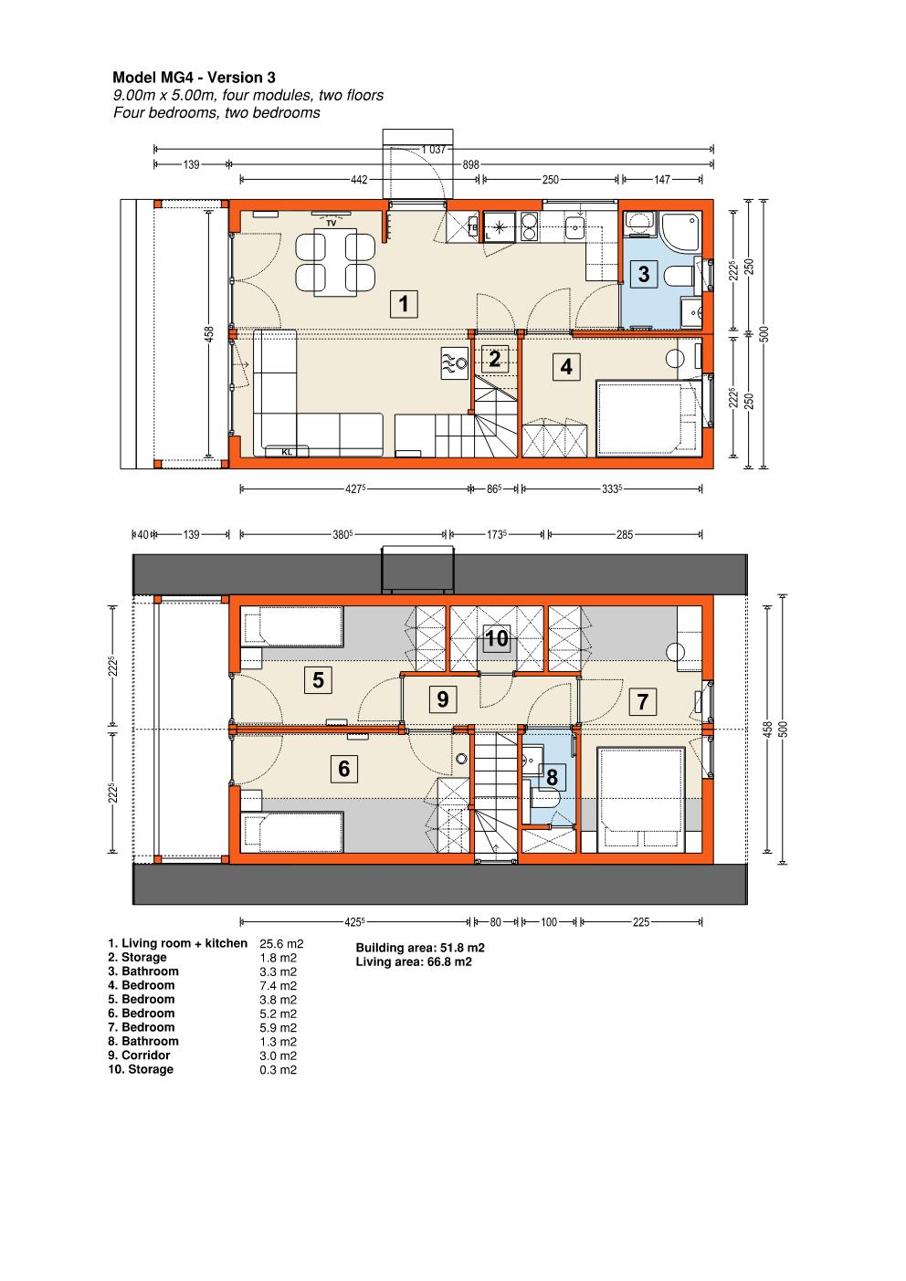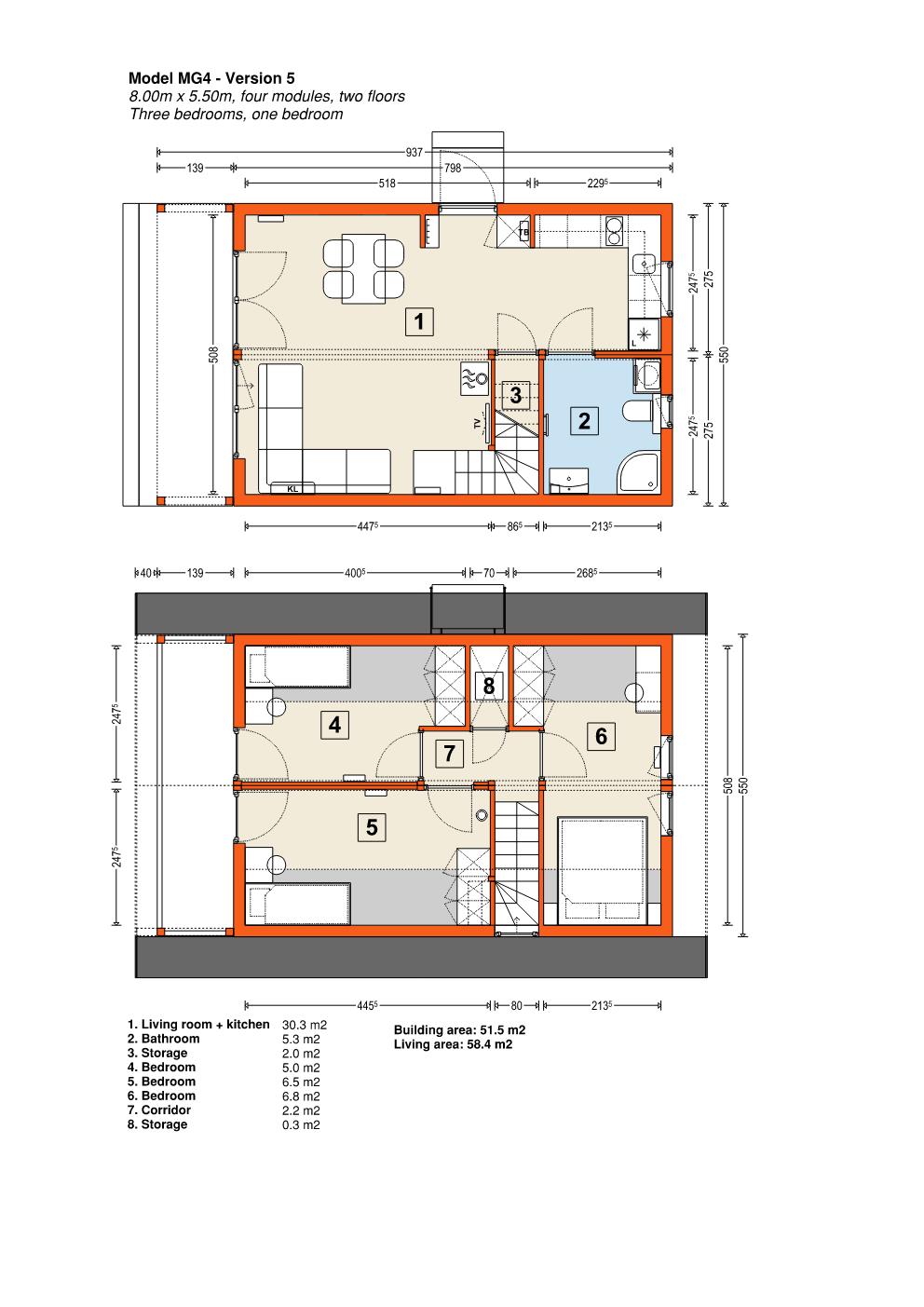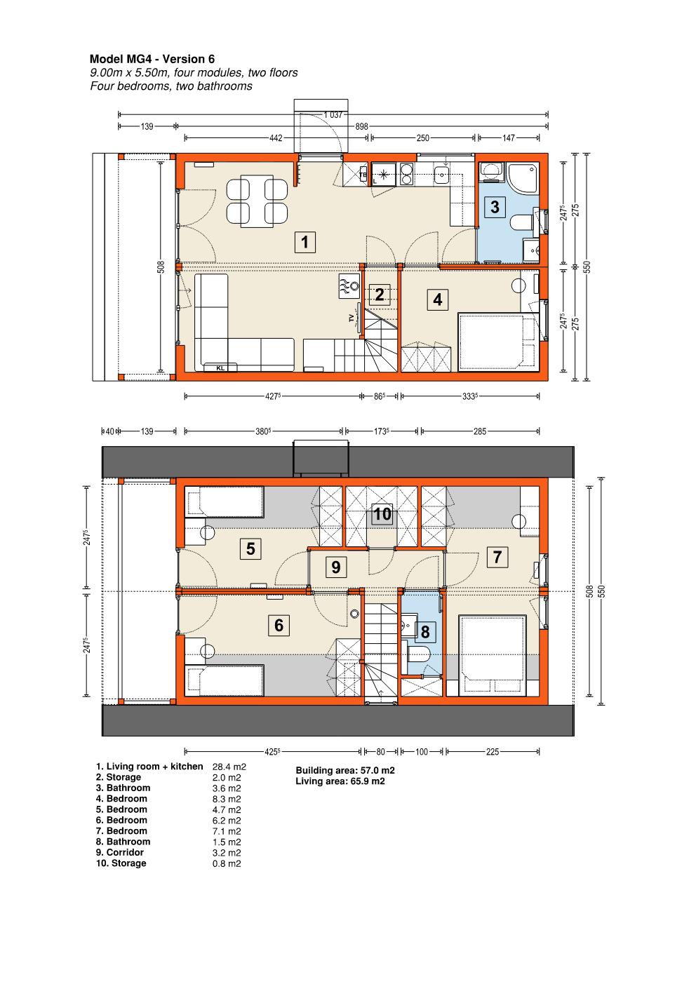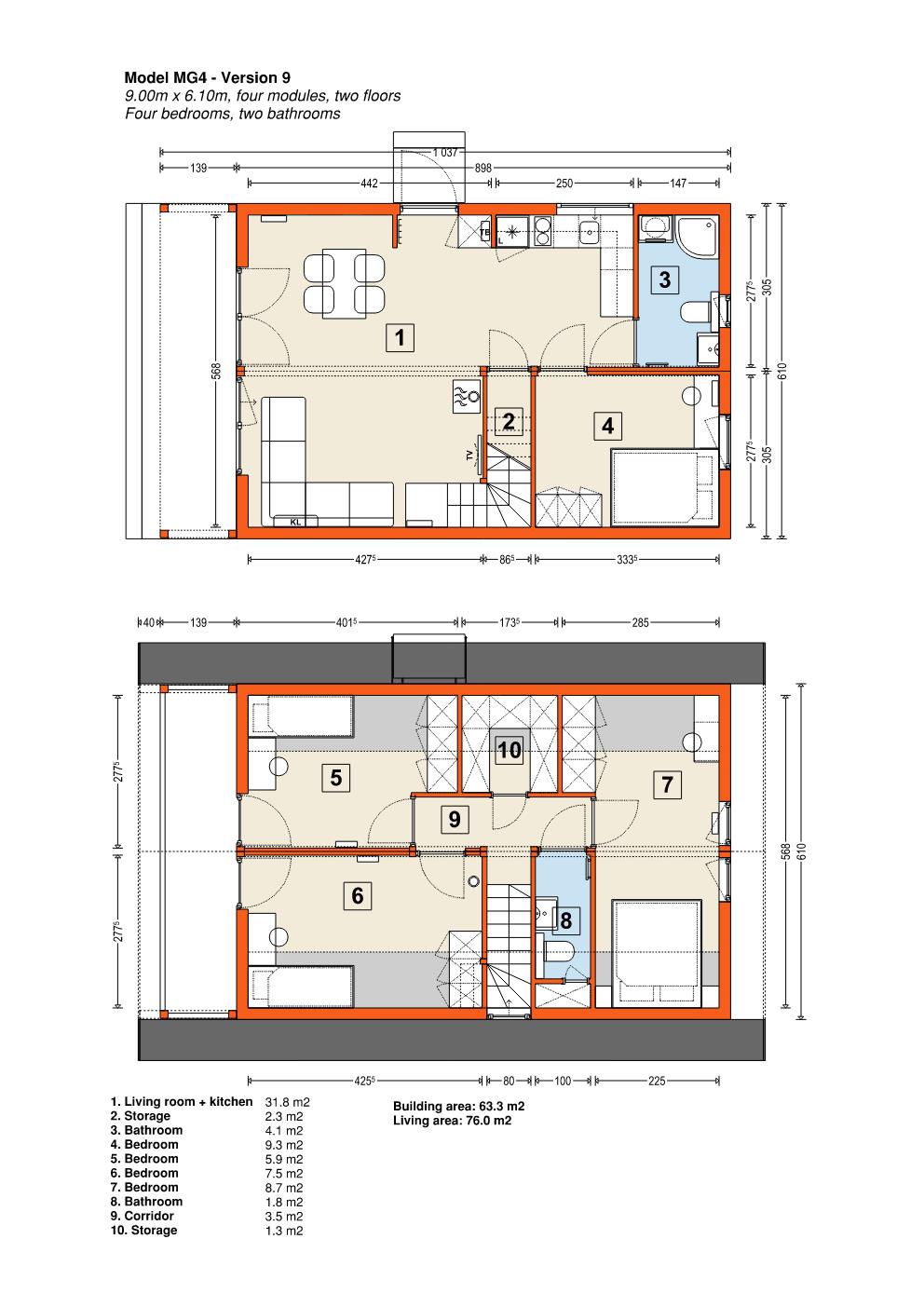 Modell MG4 – modulärt trähus. Denna byggnad består av fyra moduler som kan monteras på en enda dag. Den finns tillgänglig i nio olika stilar, med varierande storlek och planlösning, där den minsta är 40,3 m2 och den största är 76,0 m2. Designen är klassisk, med en träfasad och ett utbud av färgalternativ för anpassning. Fler moduler kan läggas till för utbyggnad, och fasaden kan kläs i antingen trä, stål eller kompositmaterial.