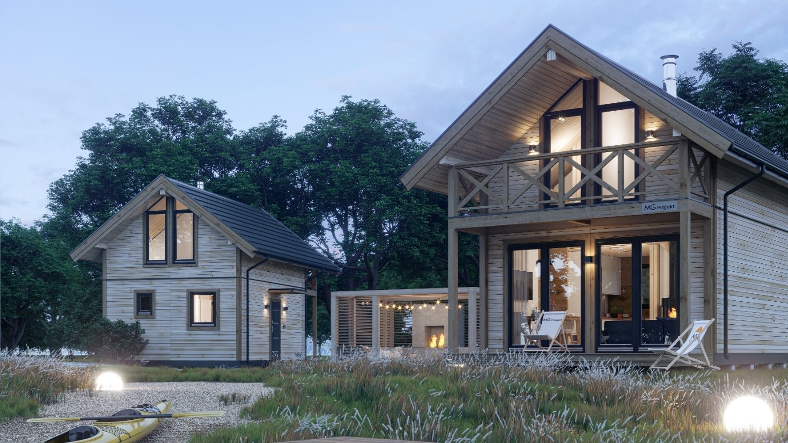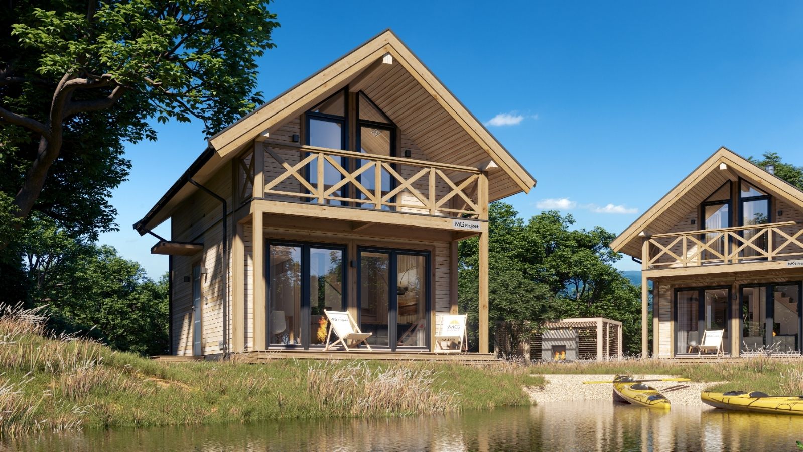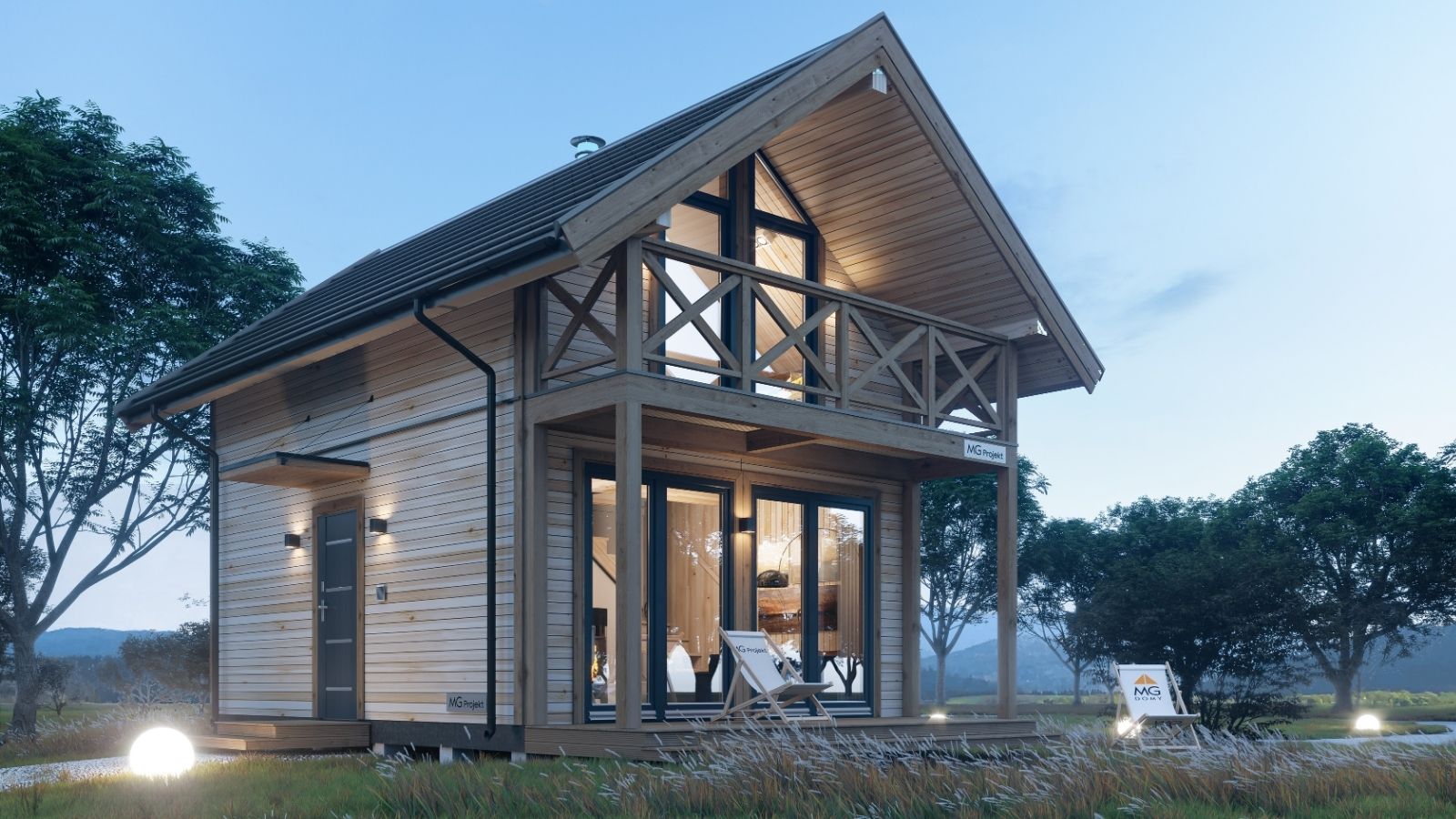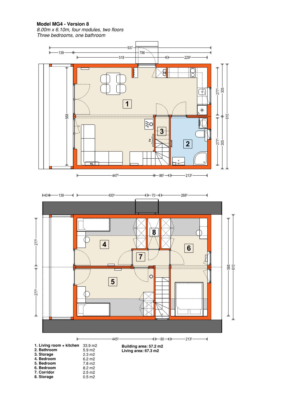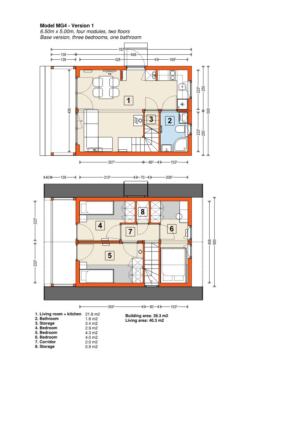 Modell MG4 – modulärt trähus. Denna byggnad består av fyra moduler som kan monteras på en enda dag. Den finns tillgänglig i nio olika stilar, med varierande storlek och planlösning, där den minsta är 40,3 m2 och den största är 76,0 m2. Designen är klassisk, med en träfasad och ett utbud av färgalternativ för anpassning. Fler moduler kan läggas till för utbyggnad, och fasaden kan kläs i antingen trä, stål eller kompositmaterial.