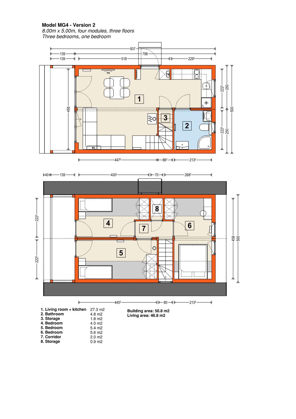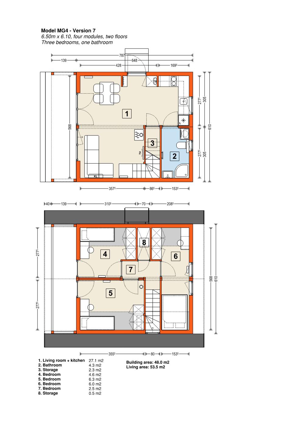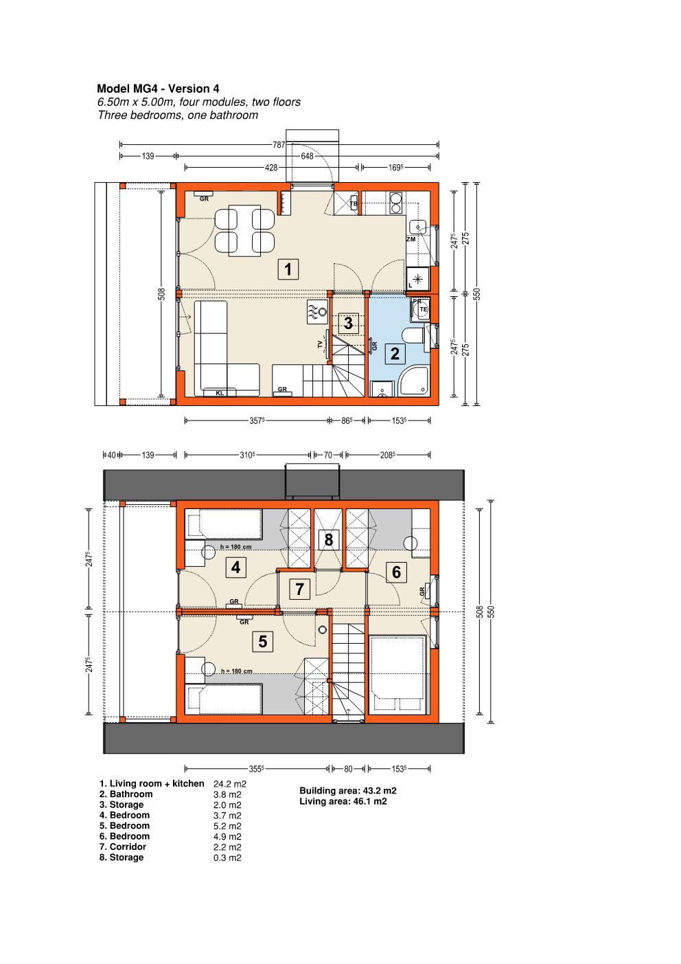 Varje modell av det modulära huset har en stål- och trästruktur, vilket garanterar hög hållbarhet och styrka. Vikten på MG3-huset, beroende på ramens storlek, är cirka 15 ton.