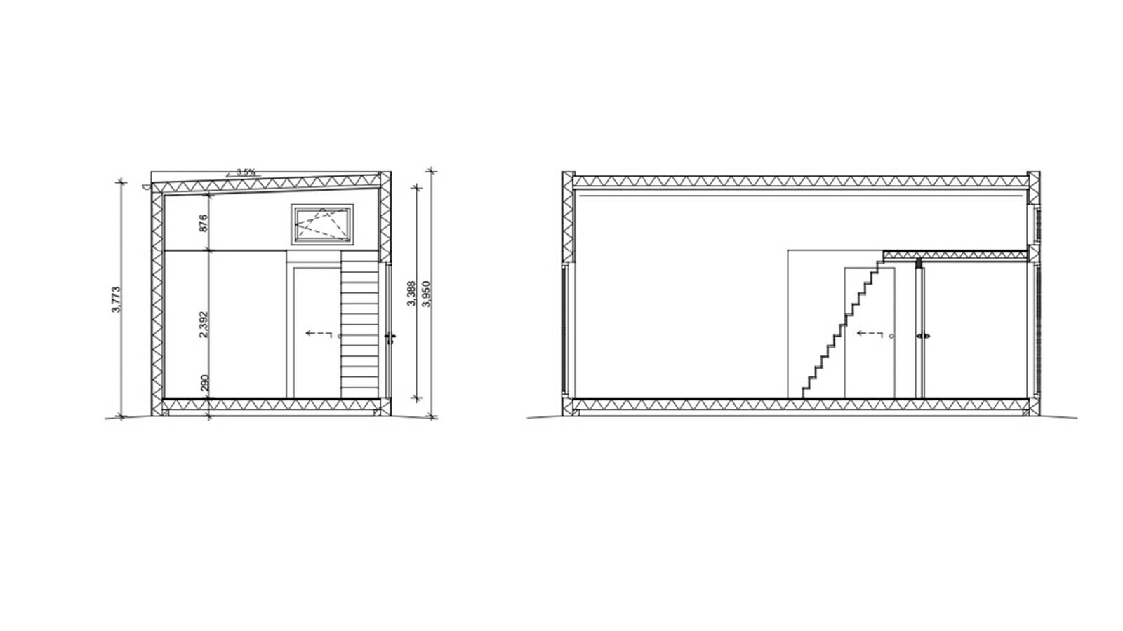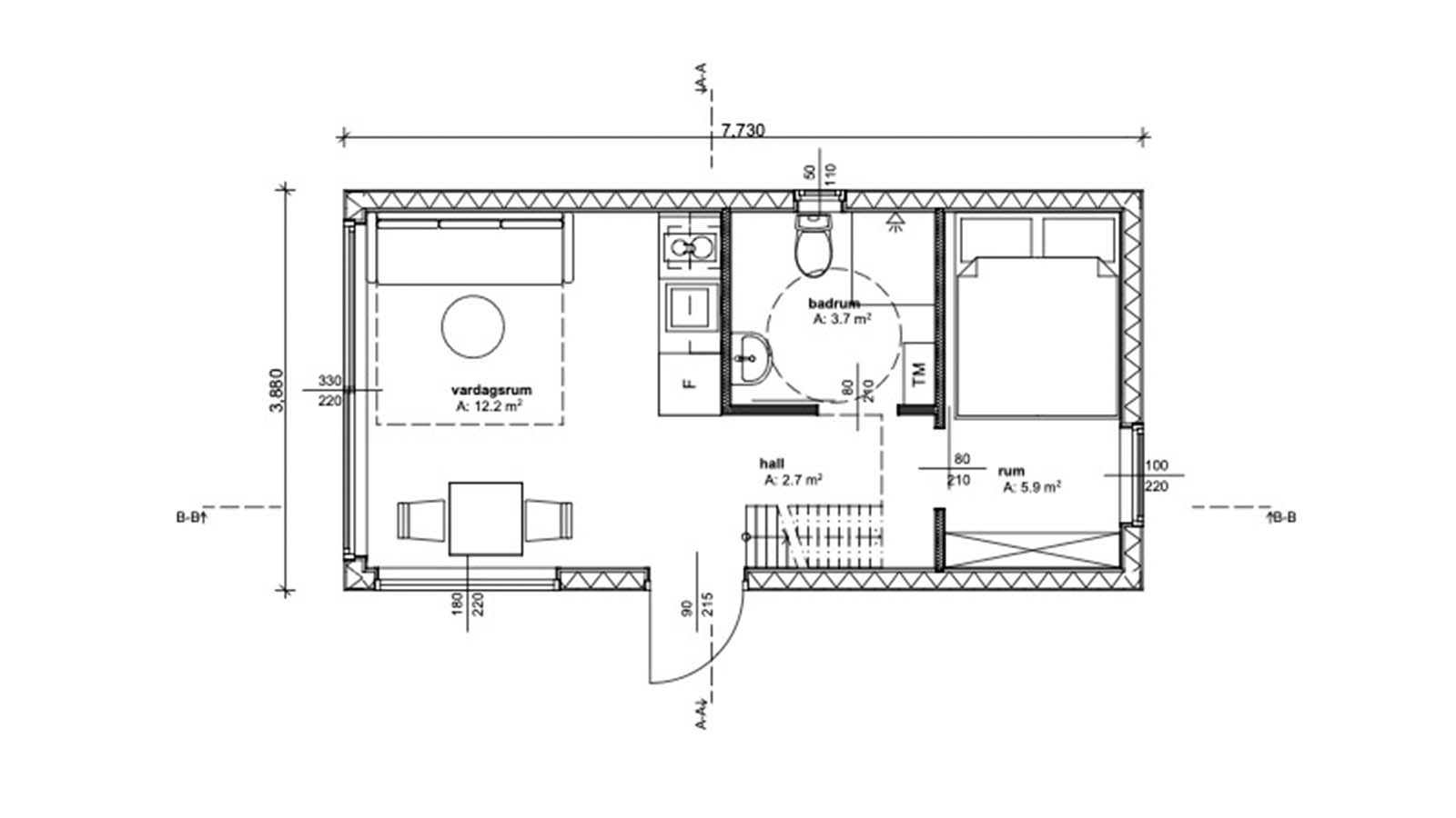 - Yttersida: längd: 7.7 m, bredd 3.9 m, höjd 3.9 m