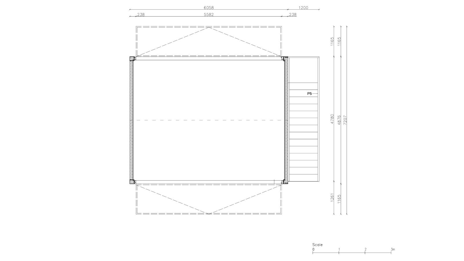 - Yttermått vid utbyggnad: längd 7,4 m, bredd 7,4 m, höjd 5,3 m