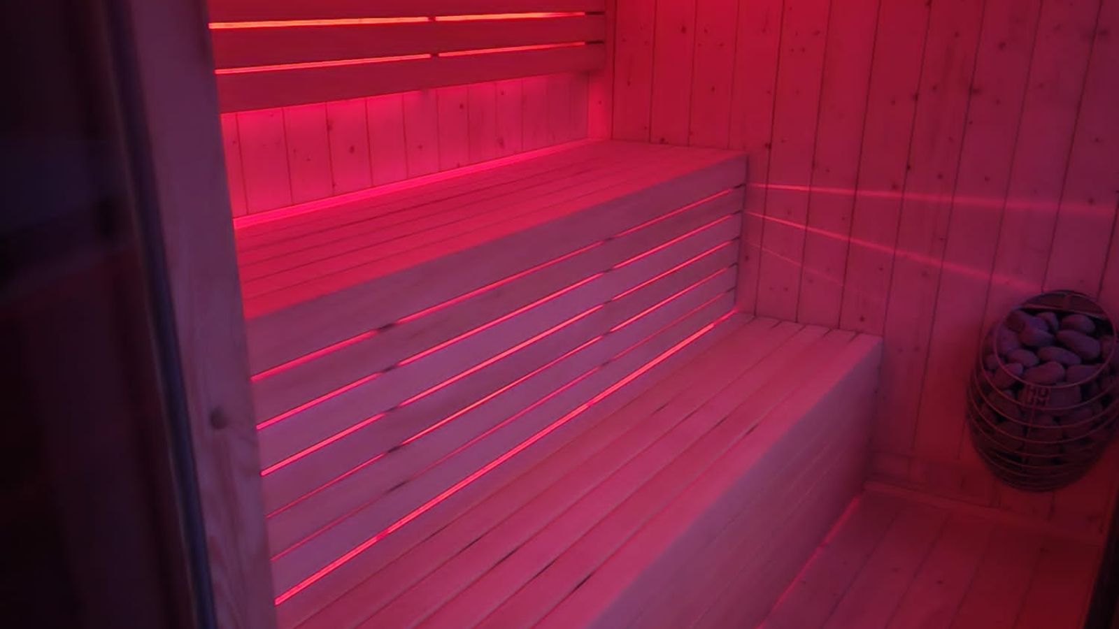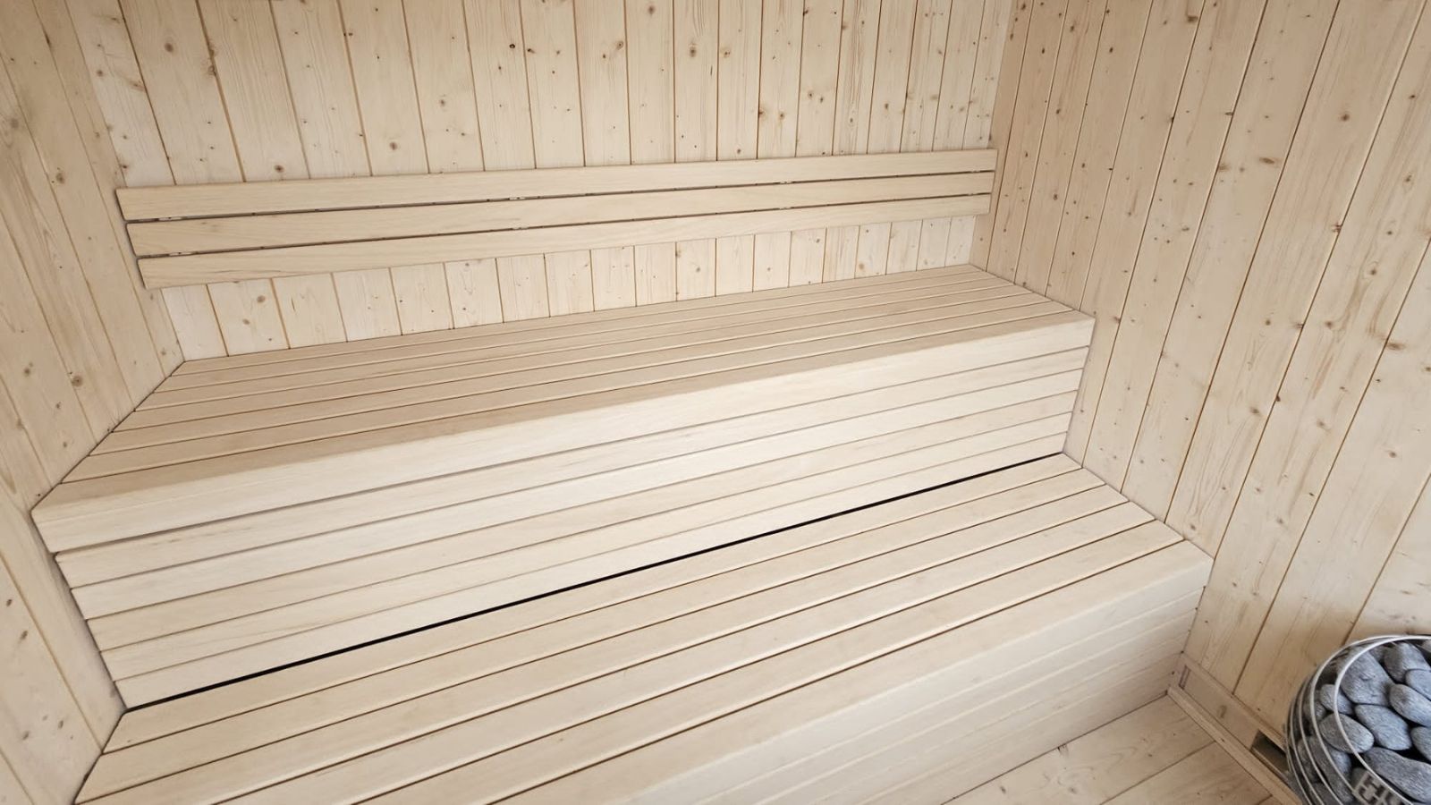 - Bastu: Klädsel av granträ, bänkar av abachiträ, härdat glas