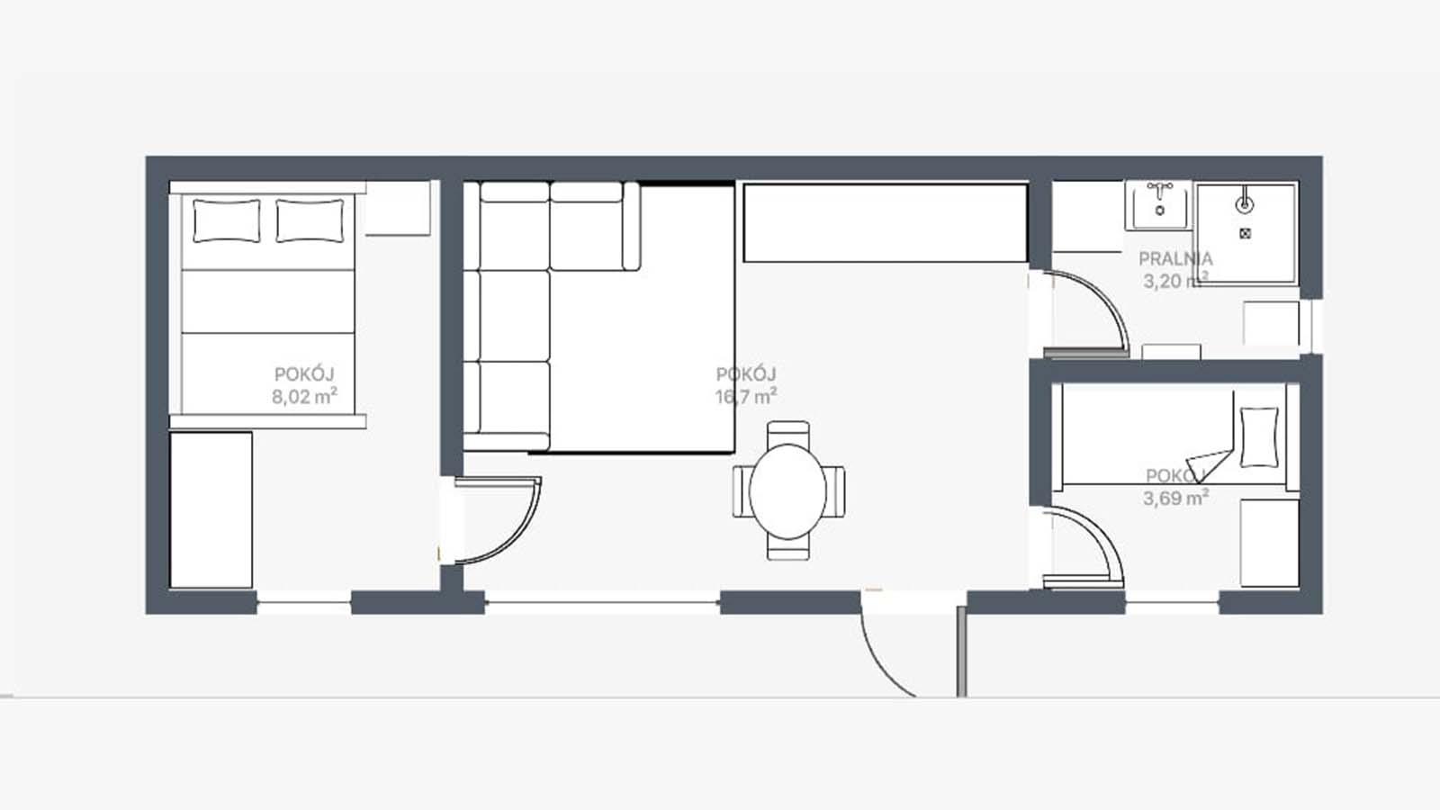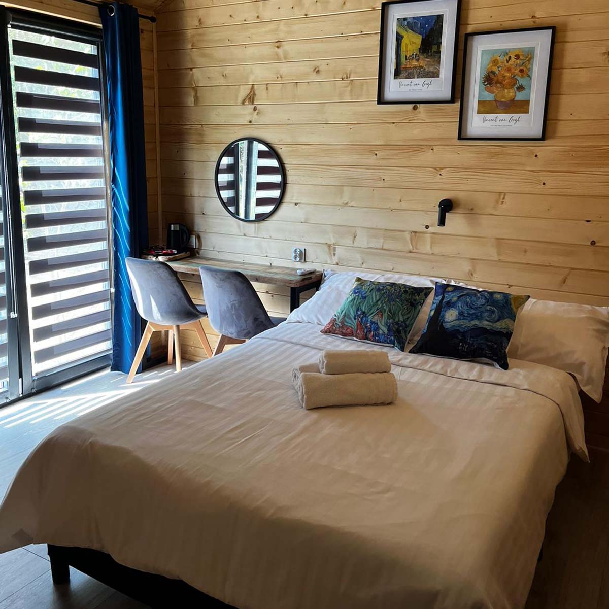 Huset har ett rymligt vardagsrum och kök, två sovrum och ett badrum. Vardagsrummet är öppet mot köket, vilket skapar ett ljust och luftigt utrymme. Sovrummen är båda bekväma och privata. Badrummet är fullt utrustat med dusch, handfat, toalett och tvättmaskin.